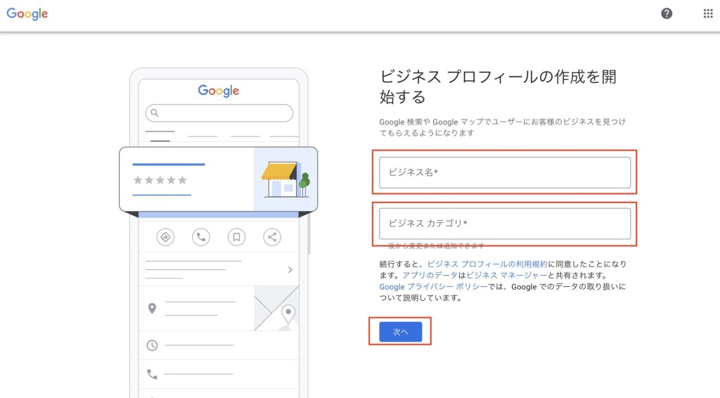 「今すぐ開始」から店舗(ビジネス)を登録します。ビジネス名には店舗の正式名称を入力しましょう。