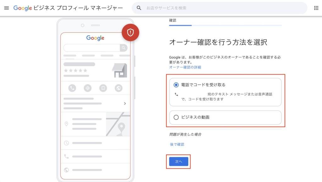 画面に従って、住所や電話番号、ウェブサイトなどを入力し、最後に「オーナー確認を行う方法を選択」を選びます。