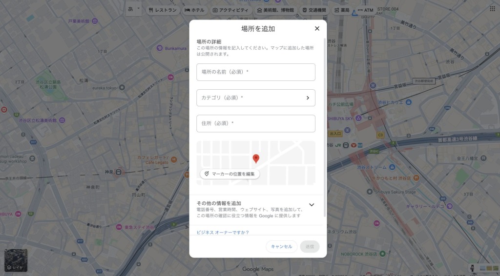 店舗名やカテゴリ、住所を入力し、マーカーの位置がズレていたら微調整したうえで「送信」をクリックします。