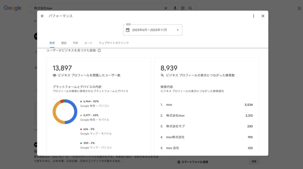 パフォーマンス機能では閲覧したユーザー数のほか、「どのような検索キーワードでたどり着いたか」「表示回数」「ウェブサイトへのアクセス数」「電話をかけた回数」「ルートを検索した件数」などを確認できます。