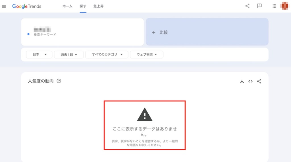 ▲Googleトレンドでキーワードを入力してもデータがないと「ここに表示するデータはありません」と表示される 編集部スクリーンショット