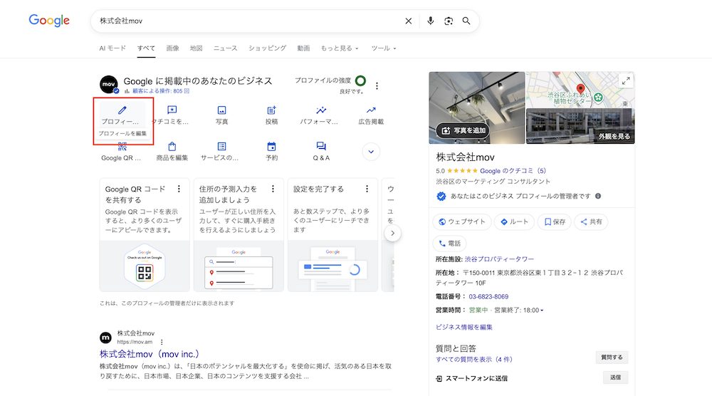 Googleビジネスプロフィールの管理画面の「プロフィールを編集」をクリック