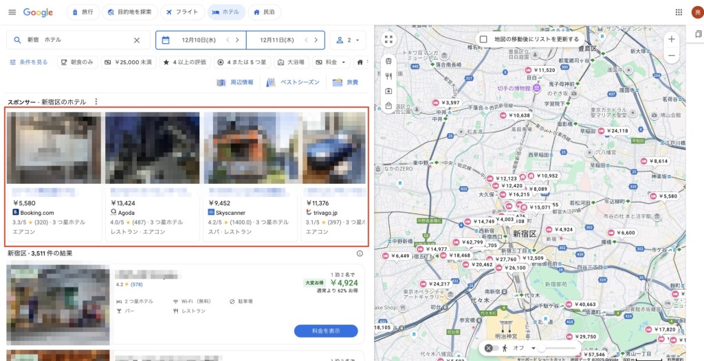 主な表示場所は、Google検索結果のホテル検索タブや、Googleマップの詳細情報パネル内です。