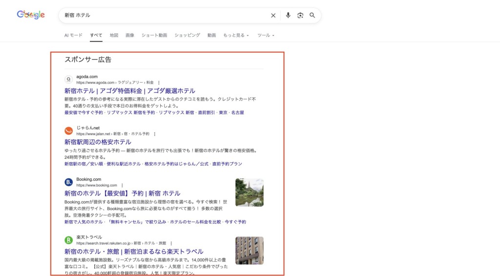 Google検索広告(リスティング広告)は、Google検索で「地域名 ホテル」などとキーワードで検索しているユーザー向けに、検索結果の上部にテキストで表示される広告です。