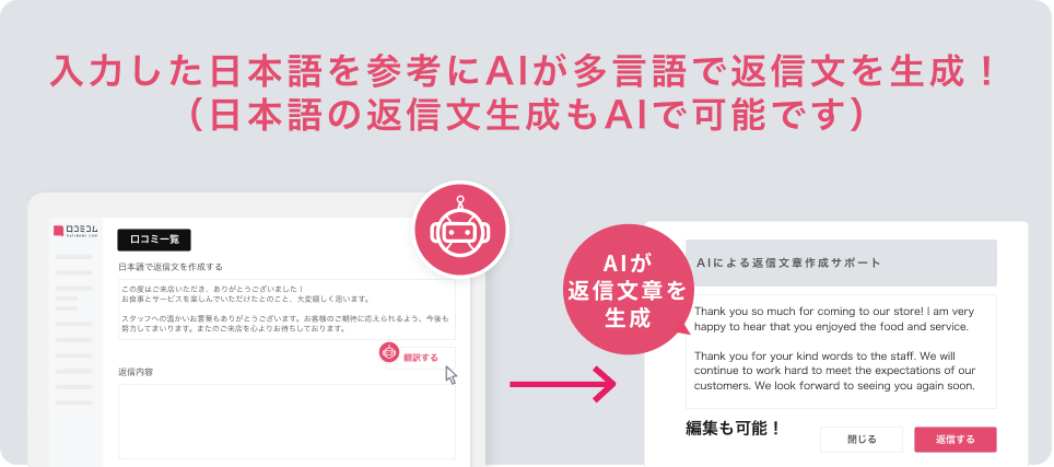 ただ、それ以上に連携先の豊富さが大きなメリットだと感じます。これまで十分に対応できていなかったOTAの口コミも管理しやすくなりましたし、インバウンドの観点ではGoogleマップと連携している点が特にありがたいです。多言語対応に関しても、口コミコム内のAIが投稿や返信をすぐに作成してくれるため、スピード感を持って対応できるようになりました。この点は、非常に強い機能だと思っています。