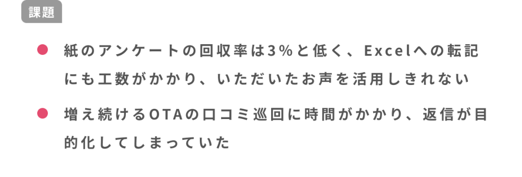 元々は客室に紙のアンケートを置き、チェックアウト時に提出いただく形で運用していましたが回収率も3%前後と低く、回覧だけに留まっていました。折角いただいた声を活かせていなかったんですよね。