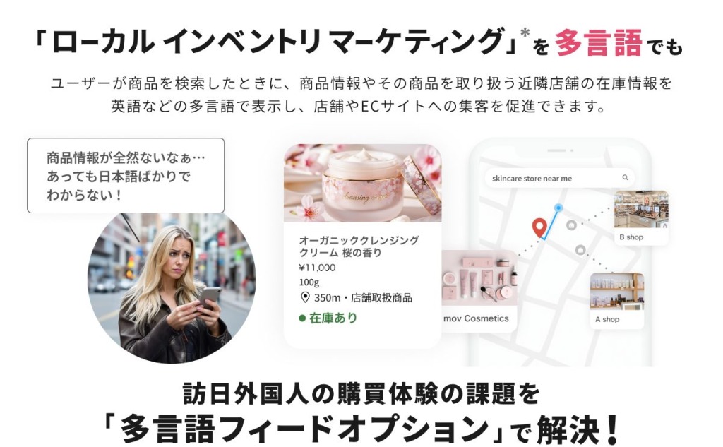 LIMの第一弾として提供している「ライトOMOサービス」に続き、今回の多言語フィードオプションでは、商品情報を英語などの多言語に翻訳し、Google検索・Googleショッピング・Googleマップ上に表示できるようになります。これにより、小売事業者様の商品や店舗の在庫情報が訪日外国人ユーザーの利用言語でも表示されるようになり、商品の認知拡大や実店舗への来店、ECサイトへの誘導を促進します。