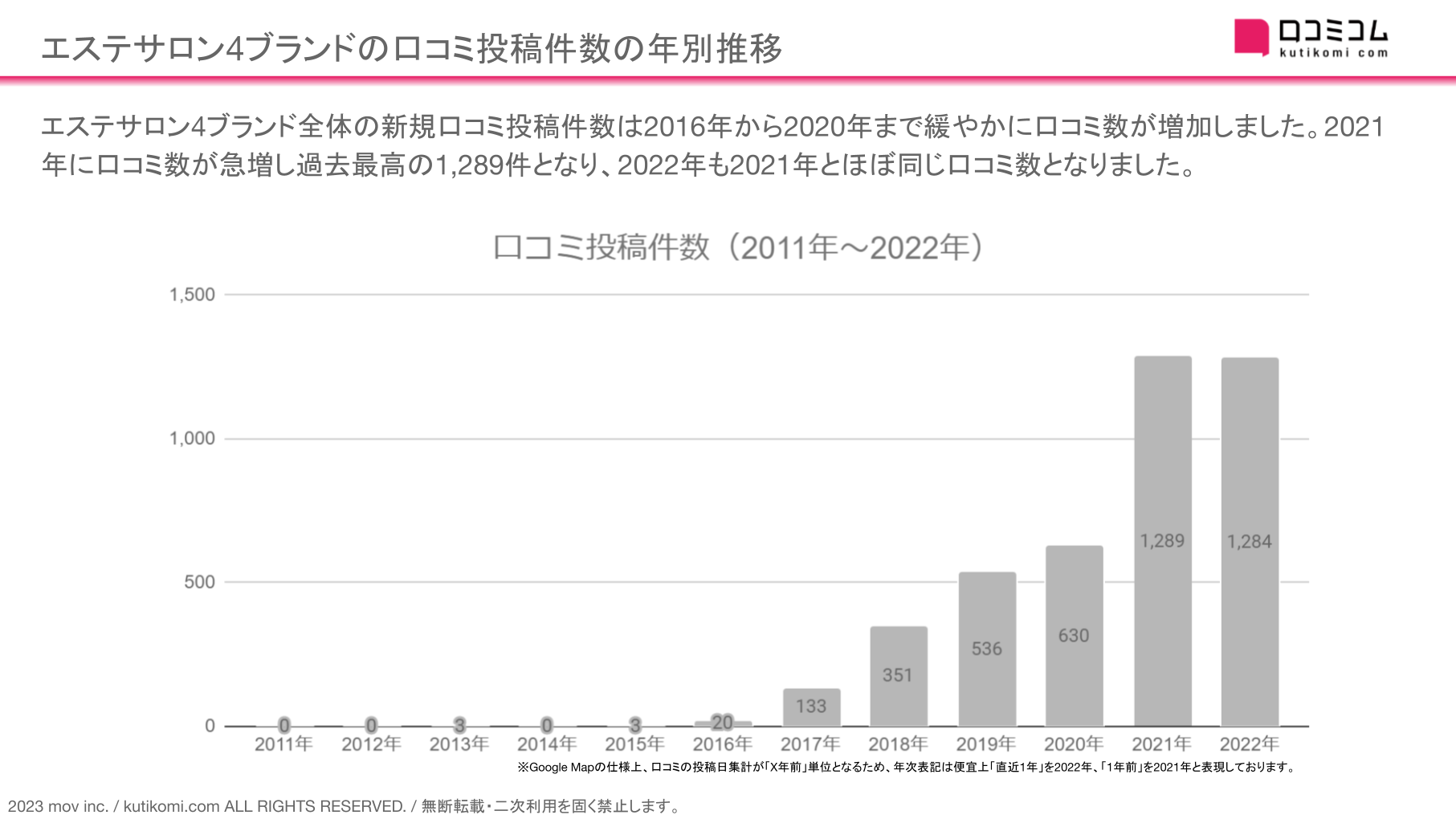 エステサロン4ブランド全体の新規口コミ投稿件数は2016年から2020年まで緩やかに口コミ数が増加しました。2021年に口コミ数が急増し過去最高の1,289件となり、2022年も2021年とほぼ同じ口コミ数となりました。