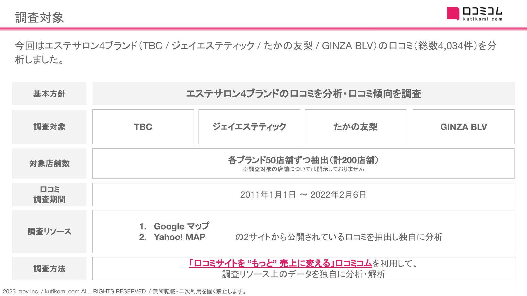 今回は、エステティックサロン4ブランド(TBC・ジェイエステティック・たかの友梨・GINZA BLV)の口コミ(総数4,034件)を分析しました。