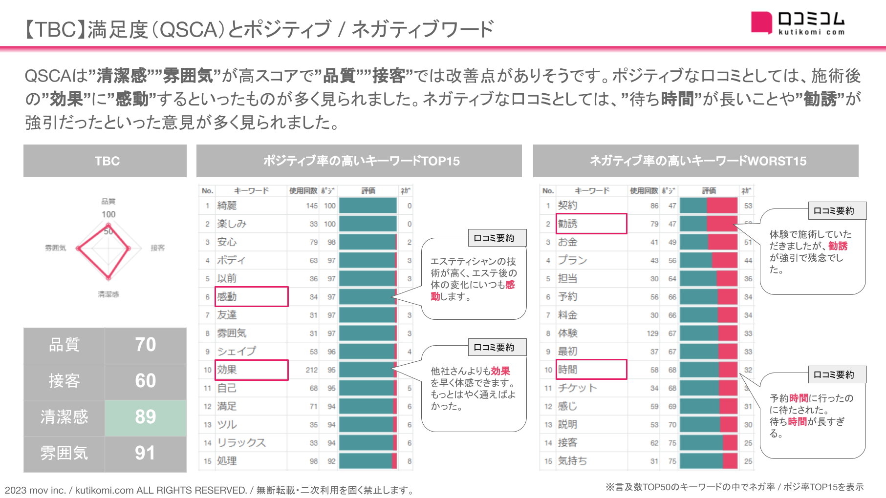 それらのAI解析を用いた分析例として「TBC」のQSCA・頻出ポジネガキーワードを確認しました。