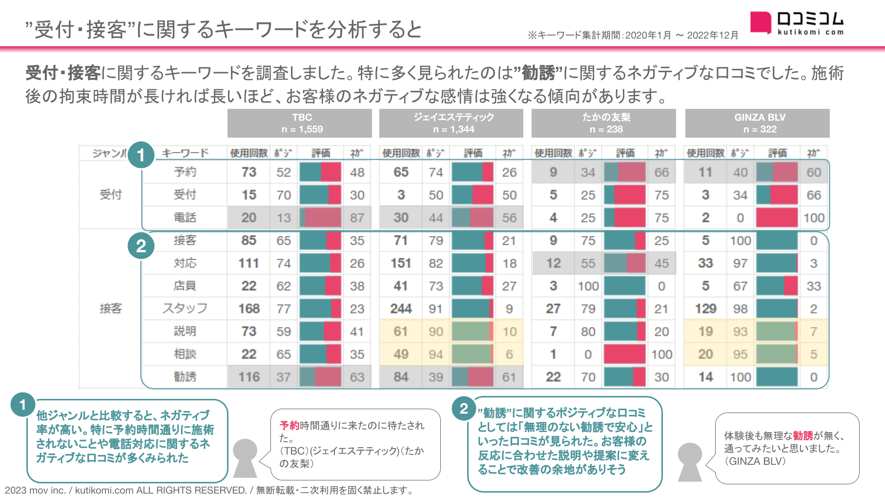 受付・接客に関するキーワードを調査しました。特に多く見られたのは”勧誘”に関するネガティブな口コミでした。施術後の拘束時間が長ければ長いほど、お客様のネガティブな感情は強くなる傾向があります。