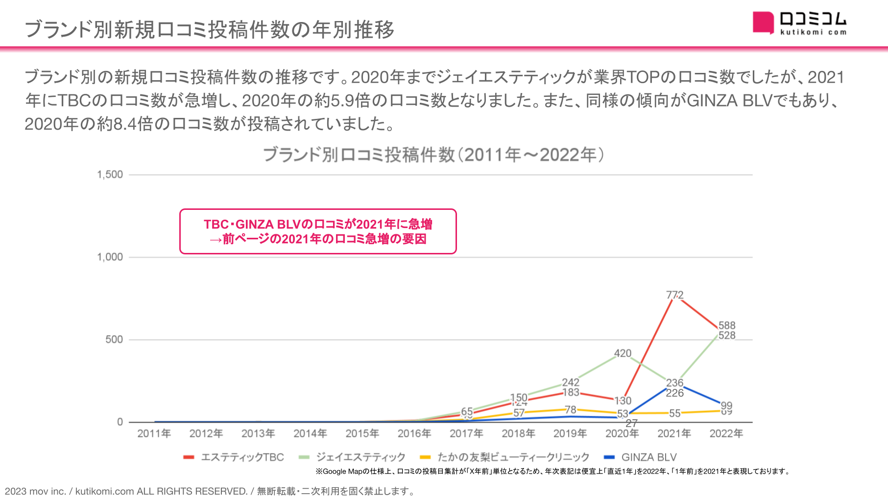 ブランド別の新規口コミ投稿件数の推移です。2020年までジェイエステティックが業界TOPの口コミ数でしたが、2021年にTBCの口コミ数が急増し、2020年の約5.9倍の口コミ数となりました。また、同様の傾向がGINZA BLVでもあり、2020年の約8.4倍の口コミ数が投稿されていました。