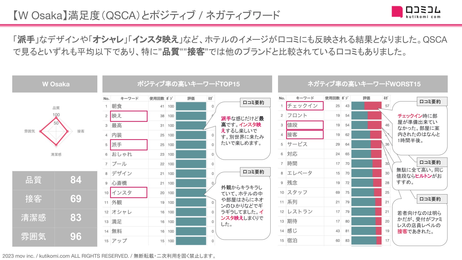 今回は、このAI解析を用いて【W Osaka】のQSCA・ポジ / ネガキーワードを確認しました。