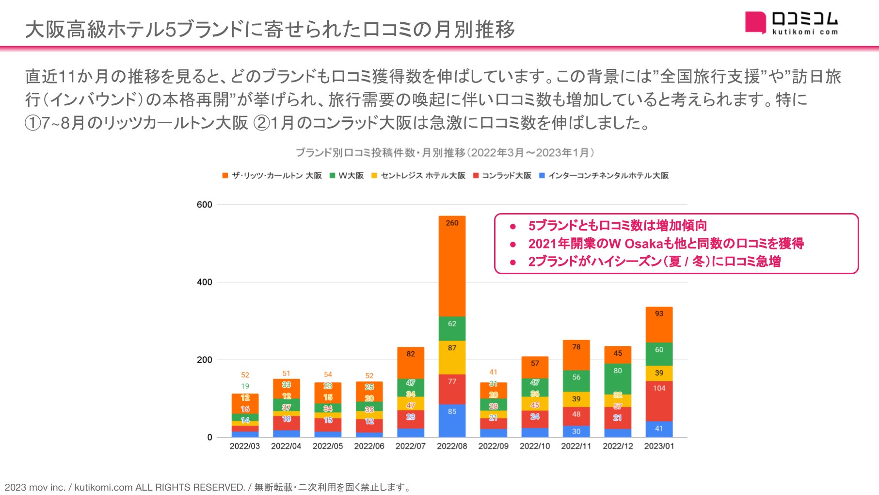 直近11か月の推移を見ると、どのブランドも口コミ獲得数を伸ばしています。この背景には”全国旅行支援”や”訪日旅行(インバウンド)の本格再開”が挙げられ、旅行需要の喚起に伴い口コミ数も増加していると考えられます。特に①7~8月のザ・リッツ・カールトン 大阪 ②1月のコンラッド大阪は急激に口コミ数を伸ばしました。