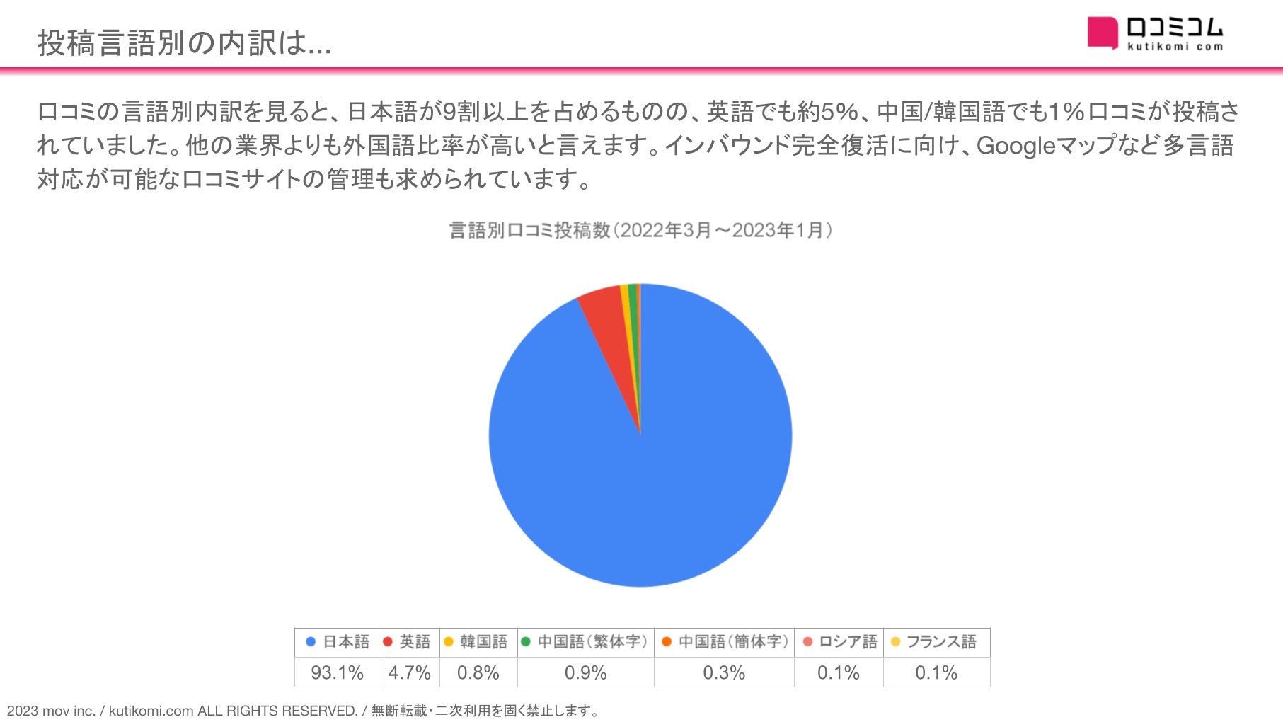 口コミの言語別内訳を見ると、日本語が9割以上を占めるものの、英語でも約5%、中国 / 韓国語でも1%口コミが投稿されていました。他の業界よりも外国語比率が高いと言えます。インバウンド完全回復に向け、Googleマップなど多言語対応が可能な口コミサイトの管理も求められています。