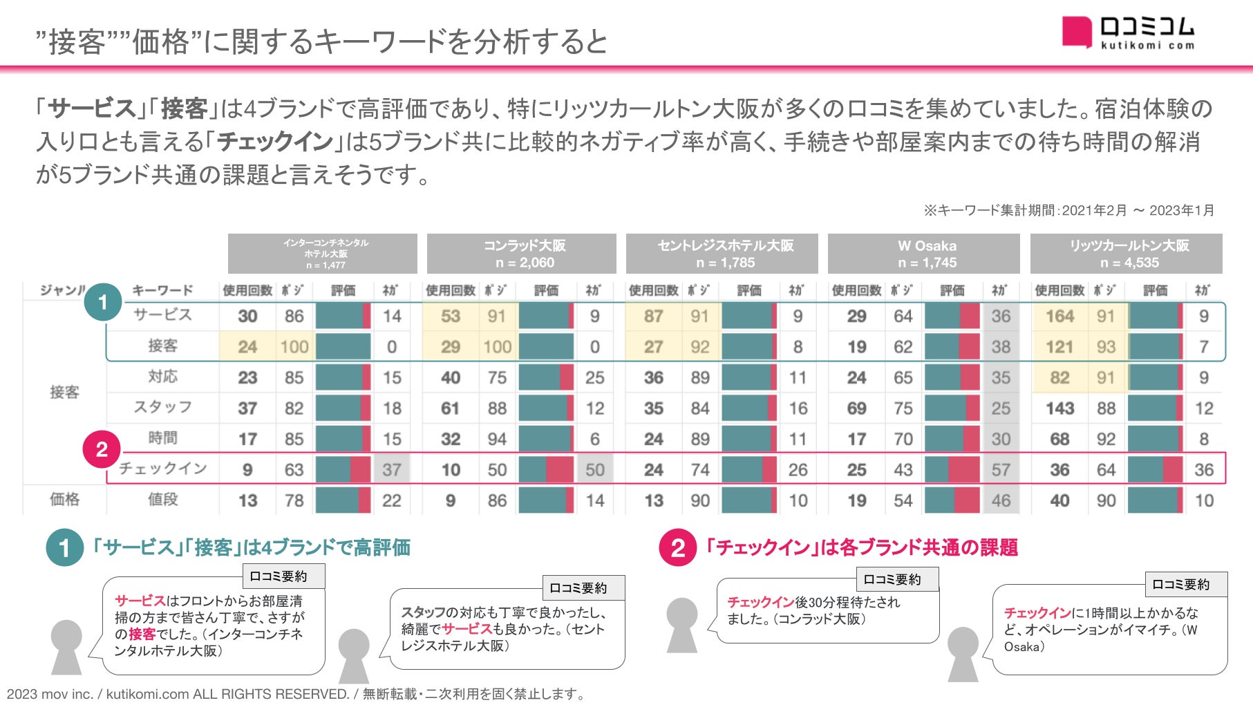 「サービス」「接客」は4ブランドで高評価であり、特にリッツカールトン大阪が多くの口コミを集めていました。宿泊体験の入り口とも言える「チェックイン」は5ブランド共に比較的ネガティブ率が高く、手続きや部屋案内までの待ち時間の解消が5ブランド共通の課題と言えそうです。