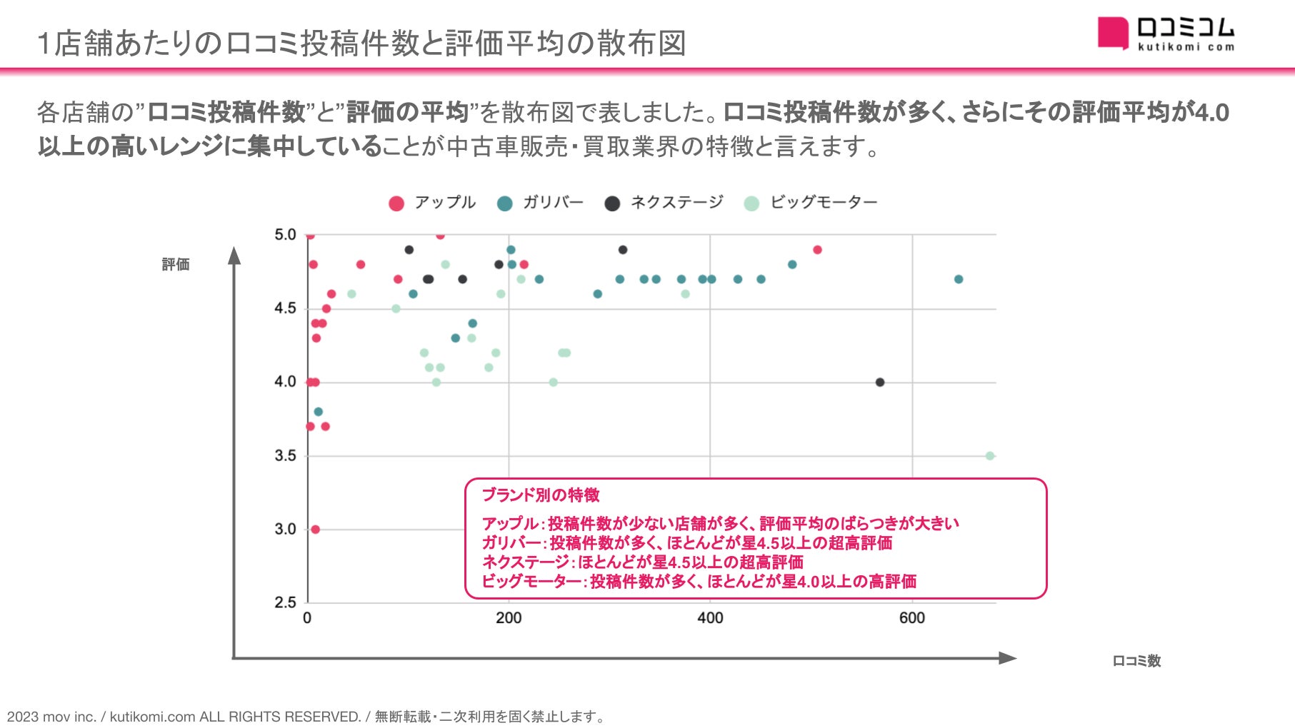 各店舗の”口コミ投稿件数”と”評価の平均”を散布図で表しました。口コミ投稿件数が多く、さらにその評価平均が4.0以上の高いレンジに集中していることが中古車販売・買取業界の特徴と言えます。