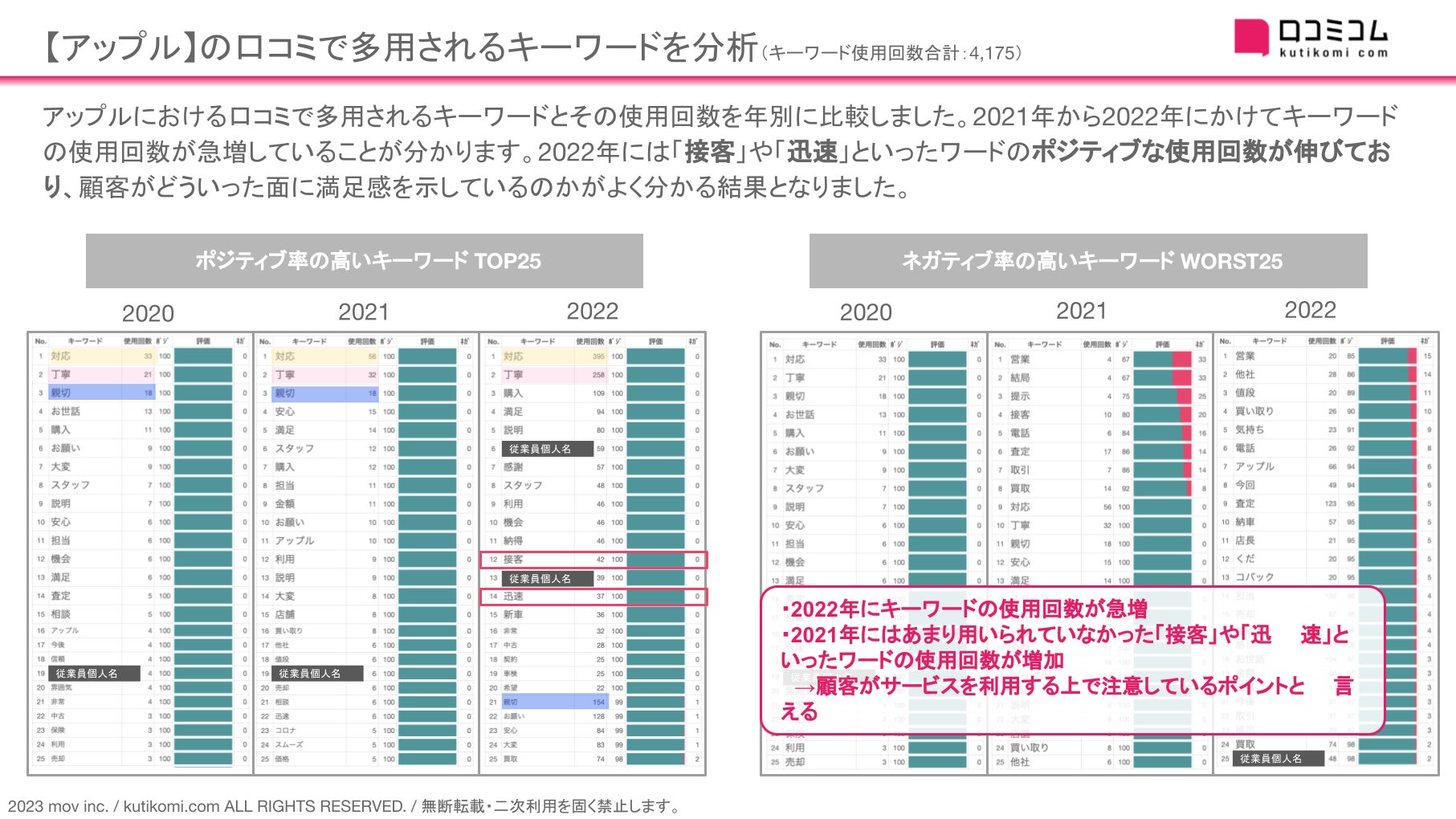 アップルにおける口コミで多用されるキーワードとその使用回数を年別に比較しました。2021年から2022年にかけてキーワードの使用回数が急増していることが分かります。2022年には「接客」や「迅速」といったワードのポジティブな使用回数が伸びており、顧客がどういった面に満足感を示しているのかがよく分かる結果となりました。
