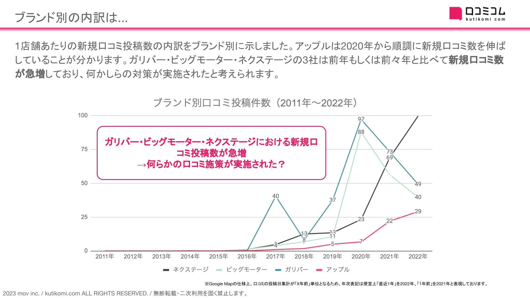 ・前年、前々年と比べて新規口コミ数が約8倍と異常に増加しているブランドがあること