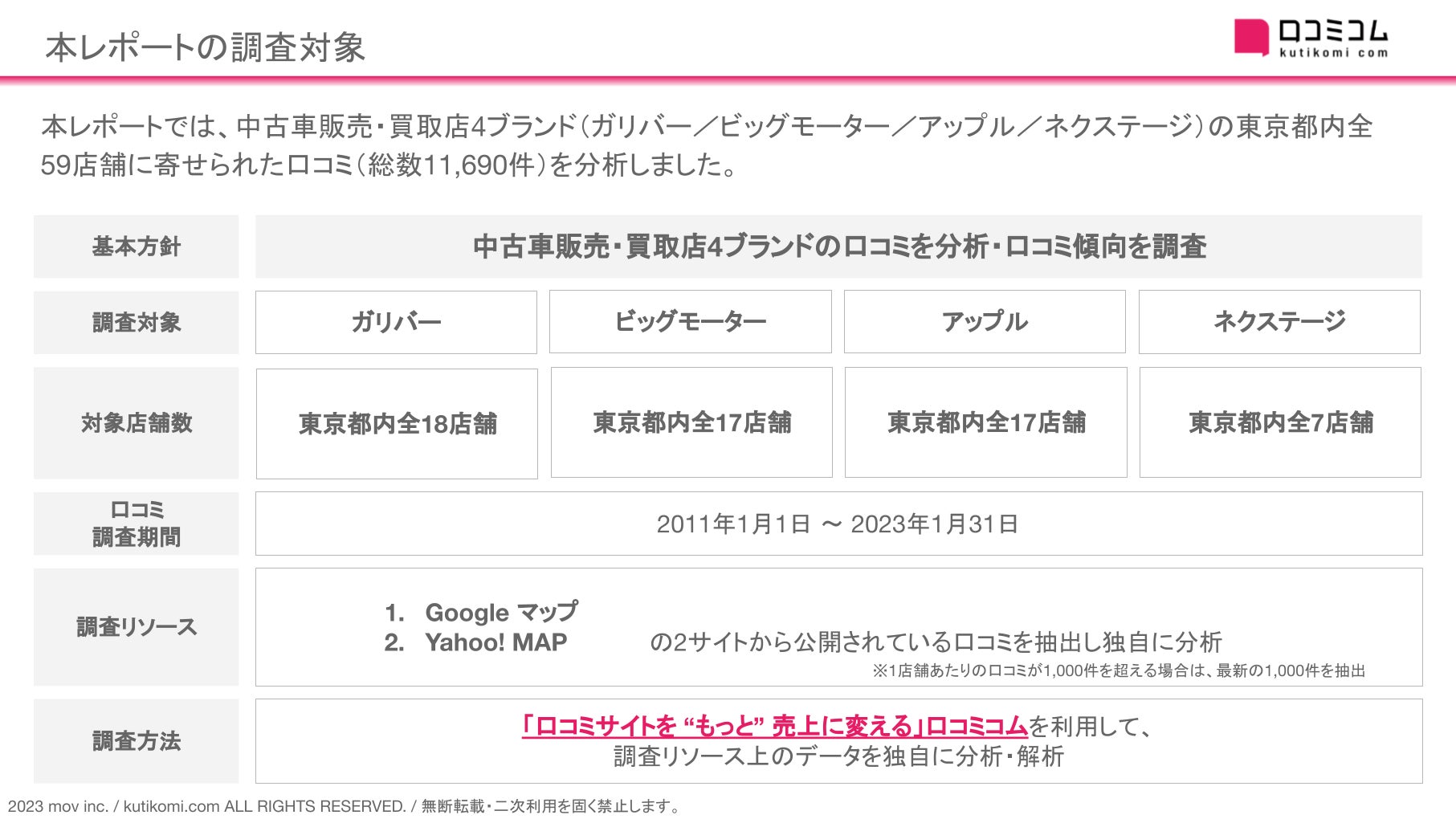 今回は、中古車販売・買取店4ブランド(ガリバー / ビッグモーター / アップル / ネクステージ)の東京都内全店舗に寄せられた口コミ(総数11,690件)を分析しました。