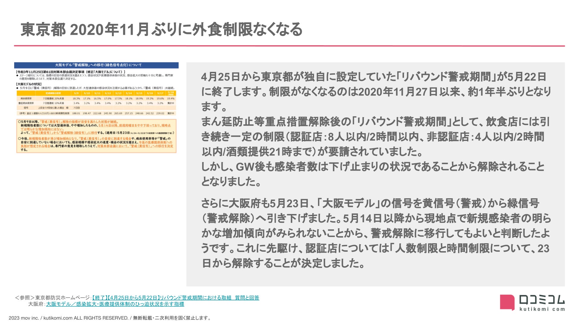 - 5月:東京都 2020年11月ぶりに外食制限なくなる