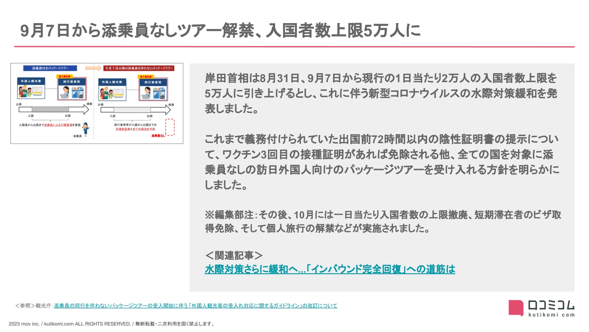 - 8月:9月7日から添乗員なしツアー解禁、入国者数上限5万人に