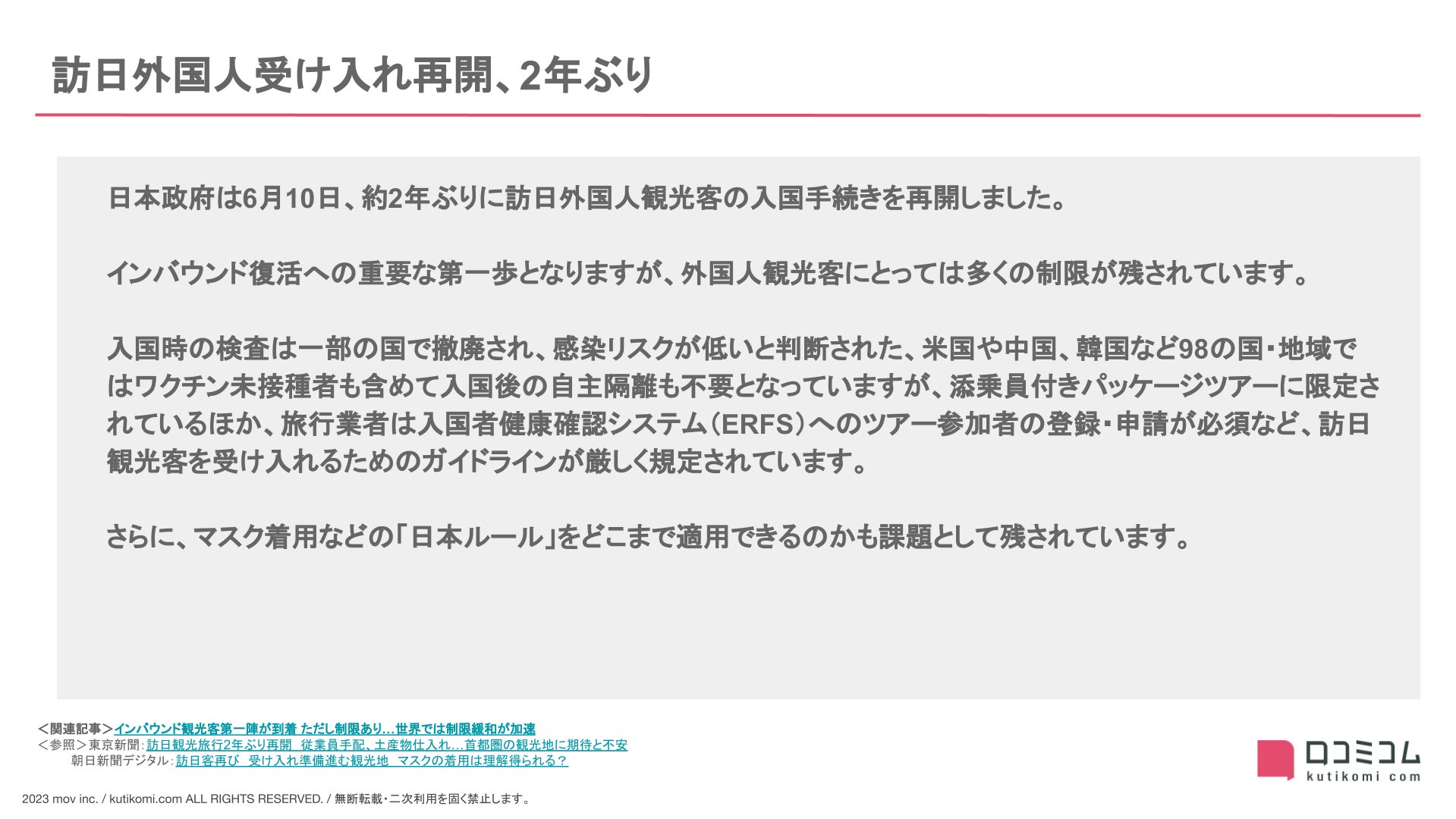 - 6月:訪日外国人受け入れ再開、2年ぶり