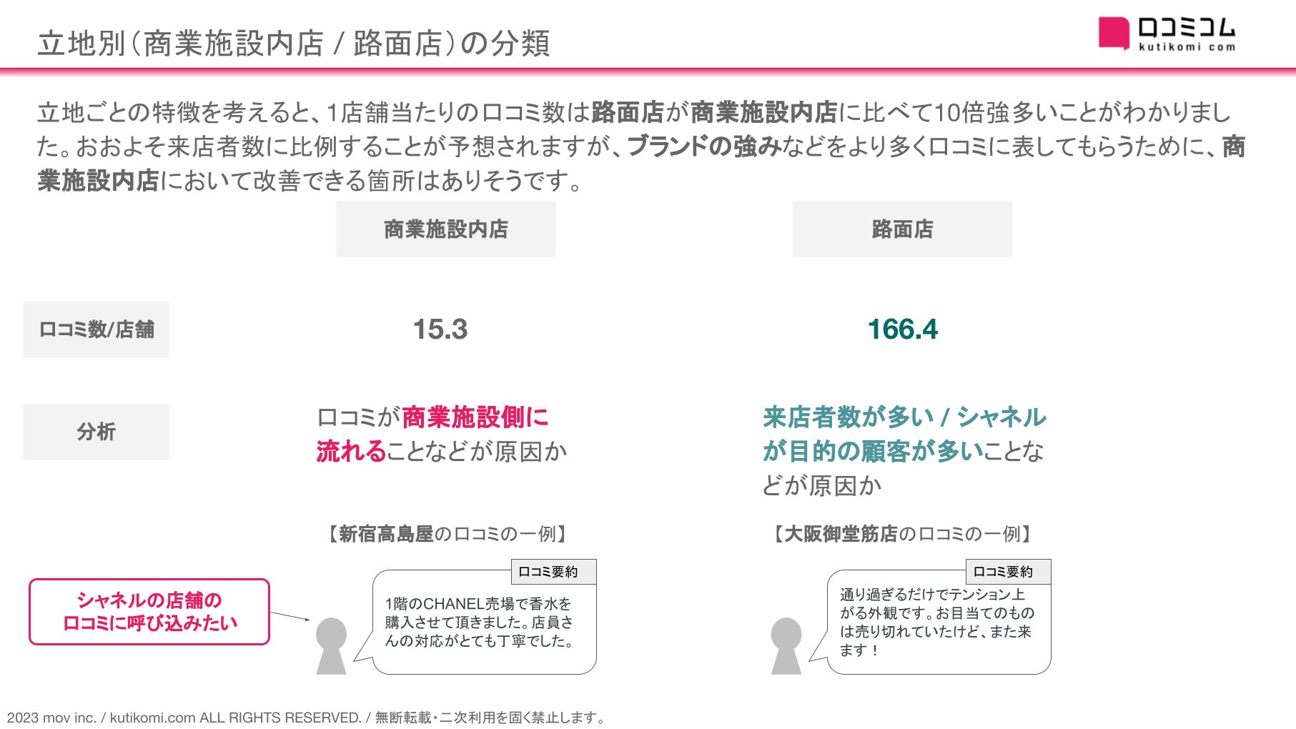 1店舗当たりの口コミ数は路面店が商業施設内店に比べて10倍強多い ことがわかりました。おおよそ来店者数に比例することが予想されますが、ブランドの強みなどをより多く口コミに表してもらうために、商業施設内店において改善できる箇所はありそう です。