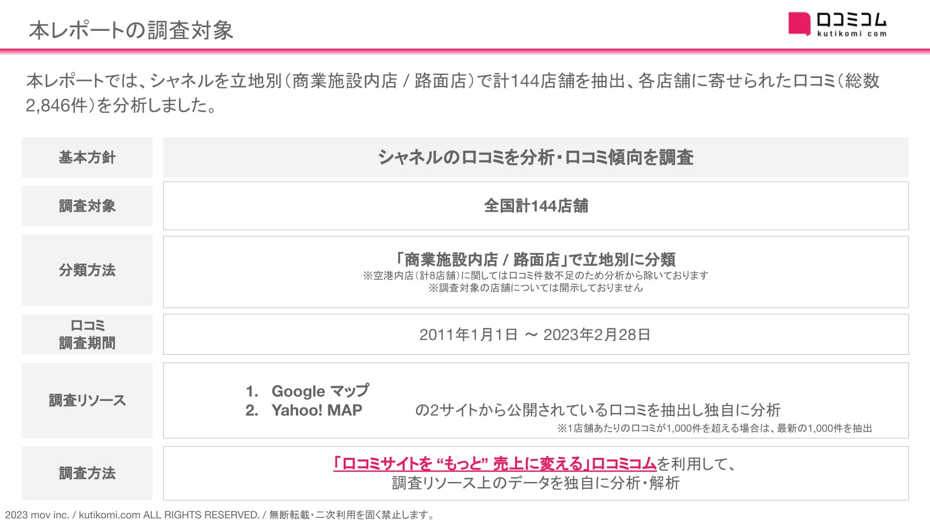 本レポートでは、国内のシャネル計144店舗を抽出、各店舗に寄せられた口コミ(総数2,846件)を分析しました。