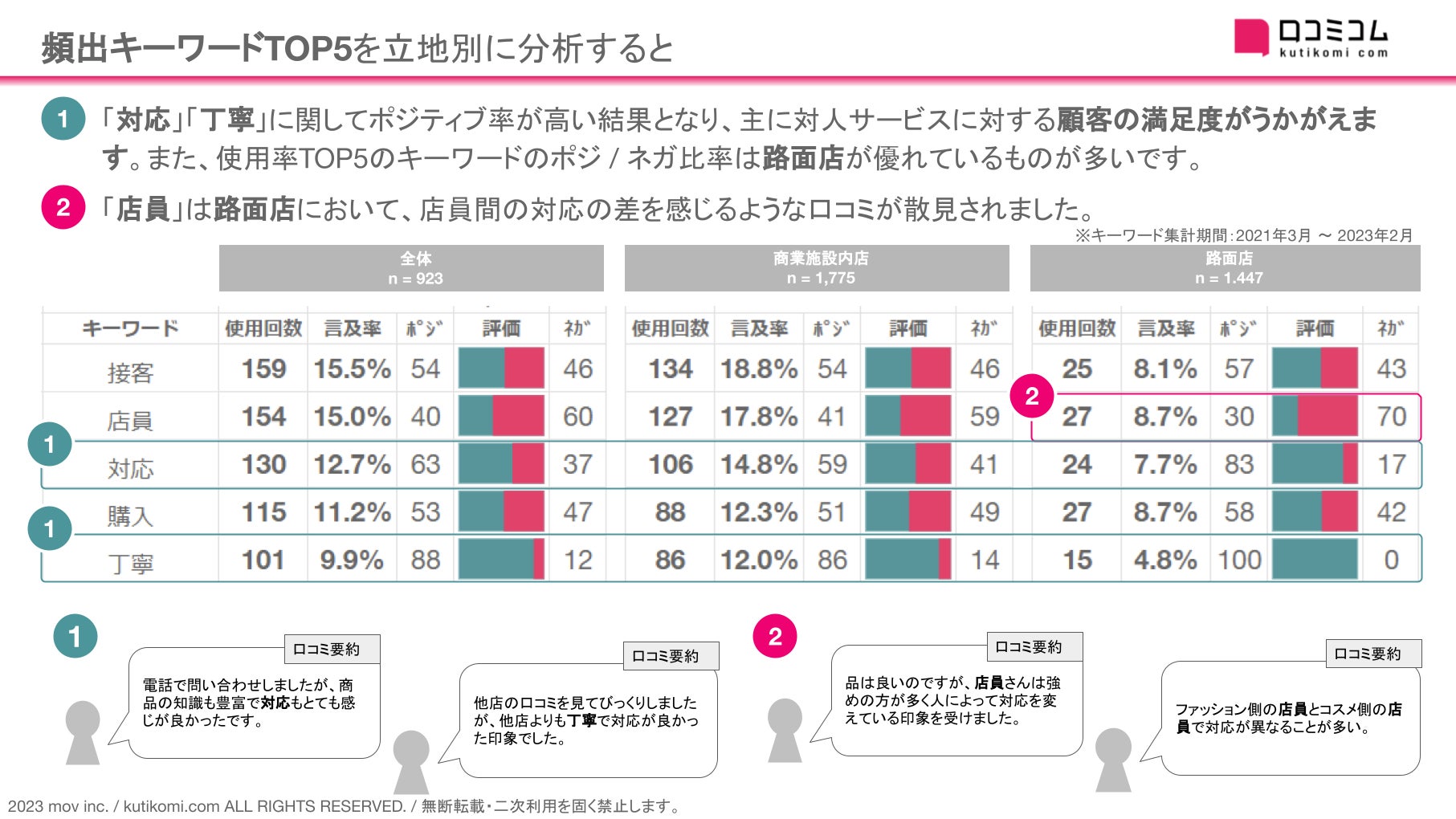 ①「対応 」「丁寧 」に関してポジティブ率が高い結果となり、主に対人サービスに対する顧客の満足度の高さ がうかがえます。また、使用率TOP5のキーワードのポジ / ネガ比率は路面店 が優れているものが多いです。