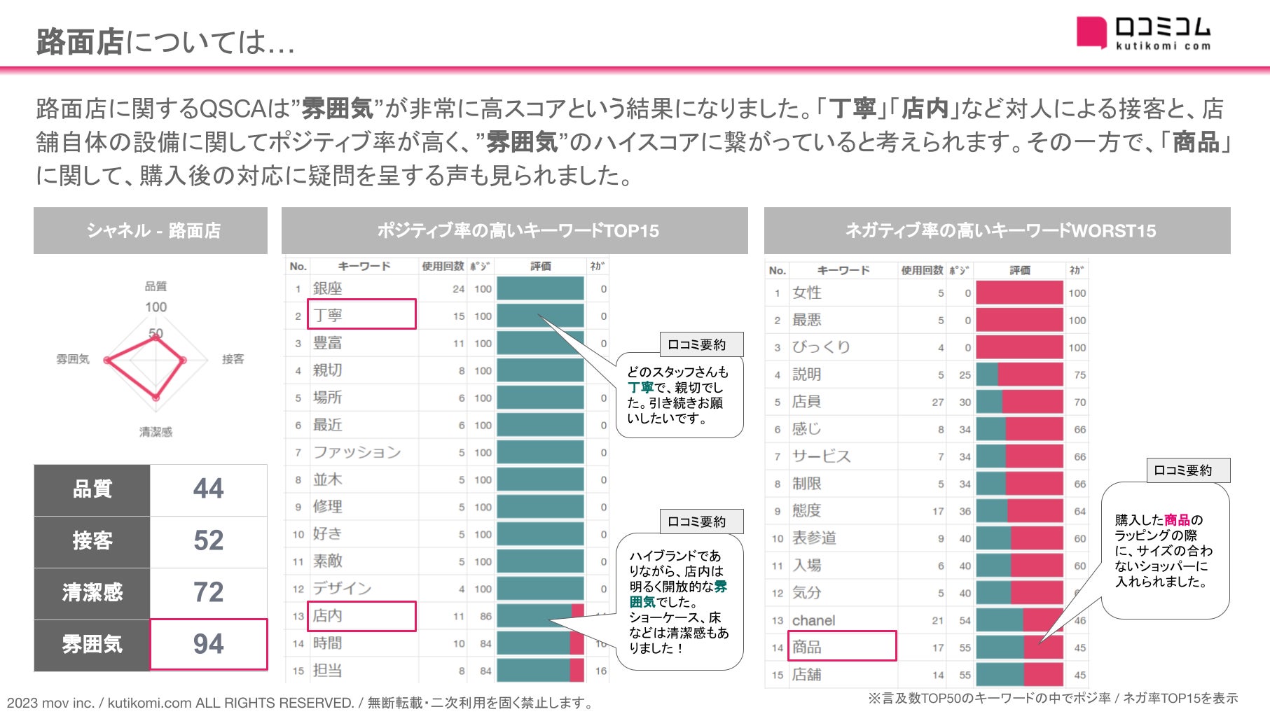 今回は、このAI解析を用いて【シャネル -路面店】 のQSCA・ポジ / ネガキーワードを確認しました。
