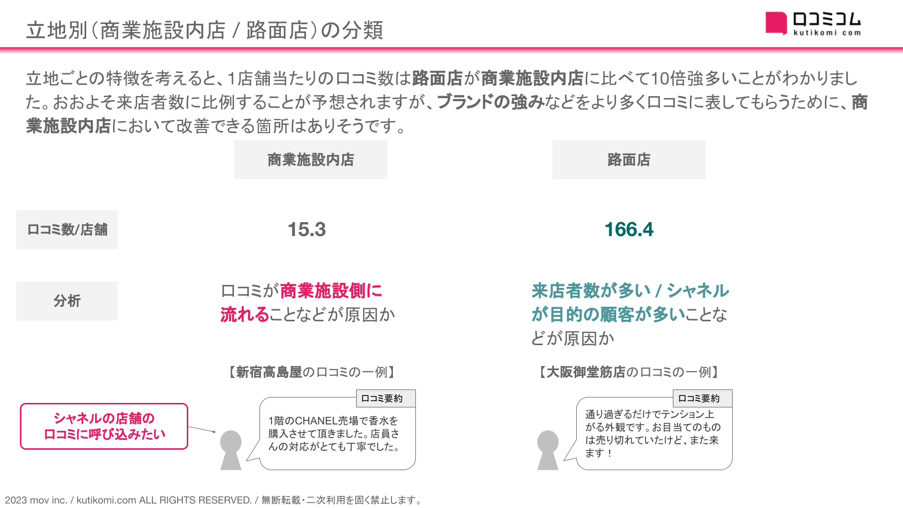 本レポートでは、国内のシャネル計144店舗を抽出、各店舗に寄せられた口コミ(総数2,846件)を分析しました。