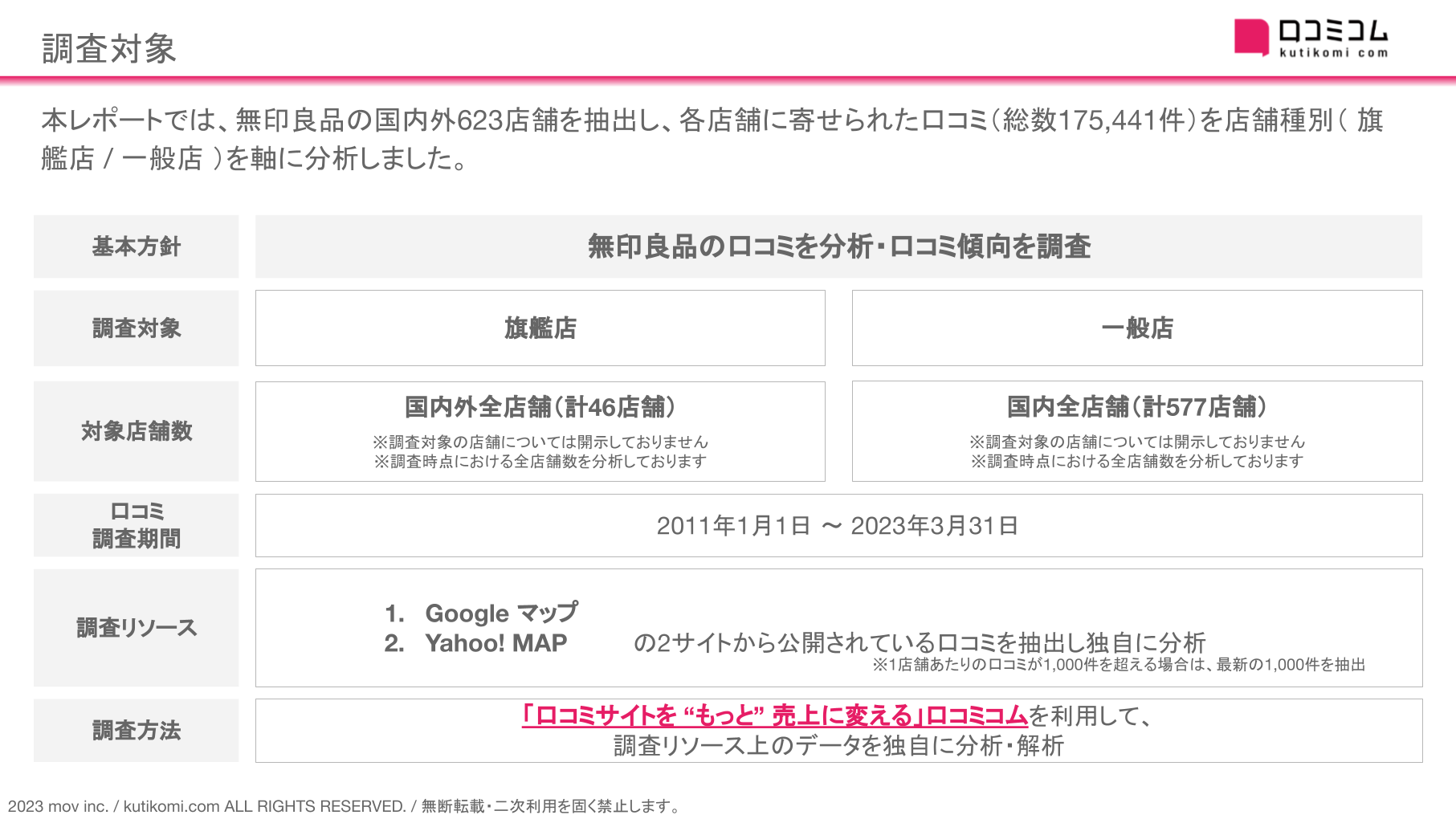 本レポートでは、無印良品の国内外623店舗を抽出し、各店舗に寄せられた口コミ(総数175,441件)を店舗種別( 旗艦店 / 一般店 )を軸に分析しました。