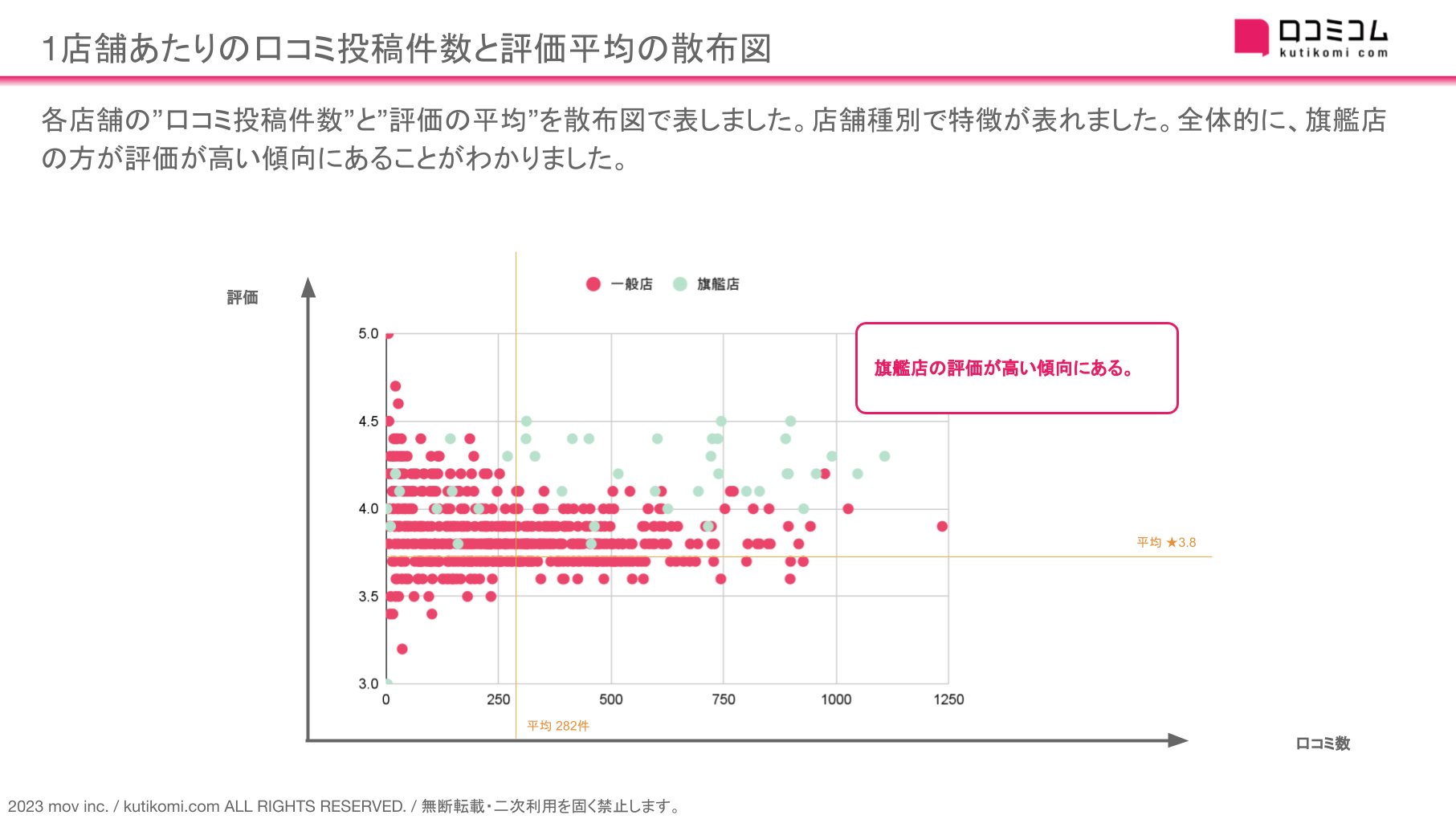各店舗の”口コミ投稿件数”と”評価の平均”を散布図で表しました。店舗種別で特徴が表れました。全体的に、旗艦店の方が評価が高い傾向にあることがわかりました。