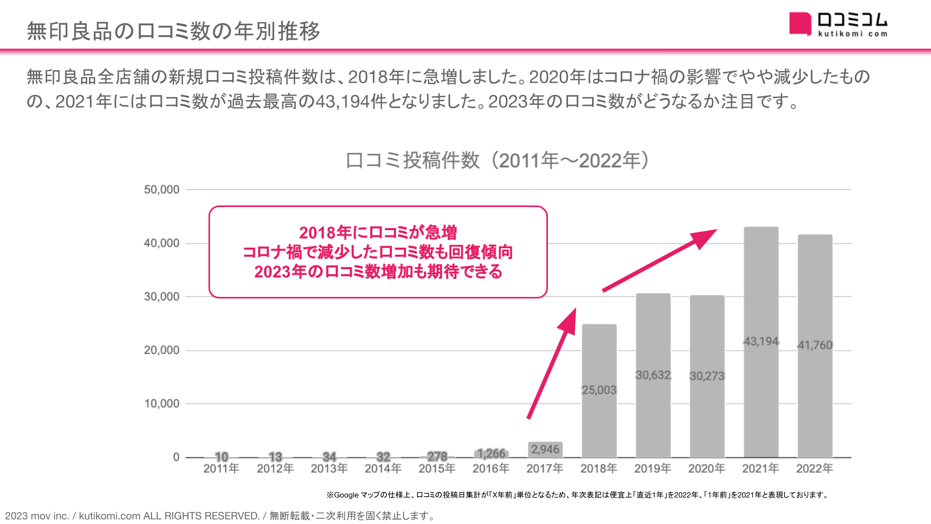 無印良品全店舗の新規口コミ投稿件数は、2018年に急増しました。2020年はコロナ禍の影響でやや減少したものの、2021年には口コミ数が過去最高の43,194件となりました。2023年の口コミ数がどうなるか注目です。