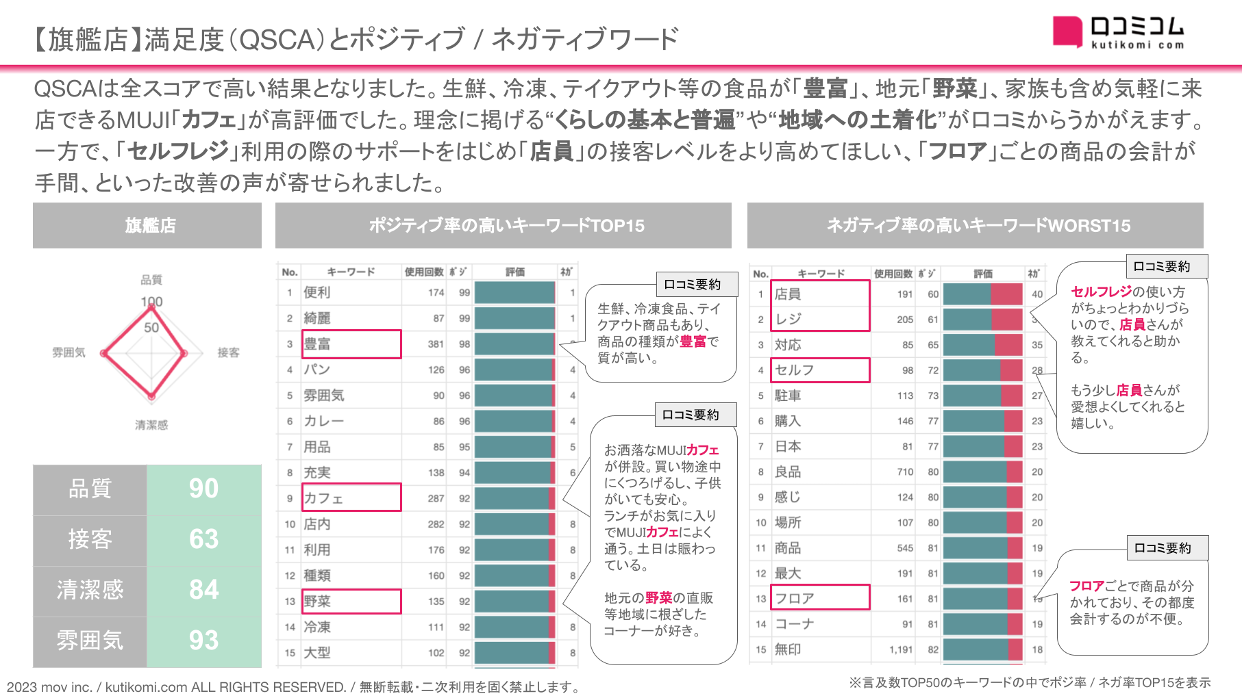 QSCAは全スコアで高い結果となりました。生鮮、冷凍、テイクアウト等の食品が「豊富」、地元「野菜」、家族も含め気軽に来店できるMUJI「カフェ」が高評価でした。理念に掲げる“くらしの基本と普遍”や“地域への土着化”が口コミからうかがえます。一方で、「セルフレジ」利用の際のサポートをはじめ「店員」の接客レベルをより高めてほしい、「フロア」ごとの商品の会計が手間、といった改善の声が寄せられました。