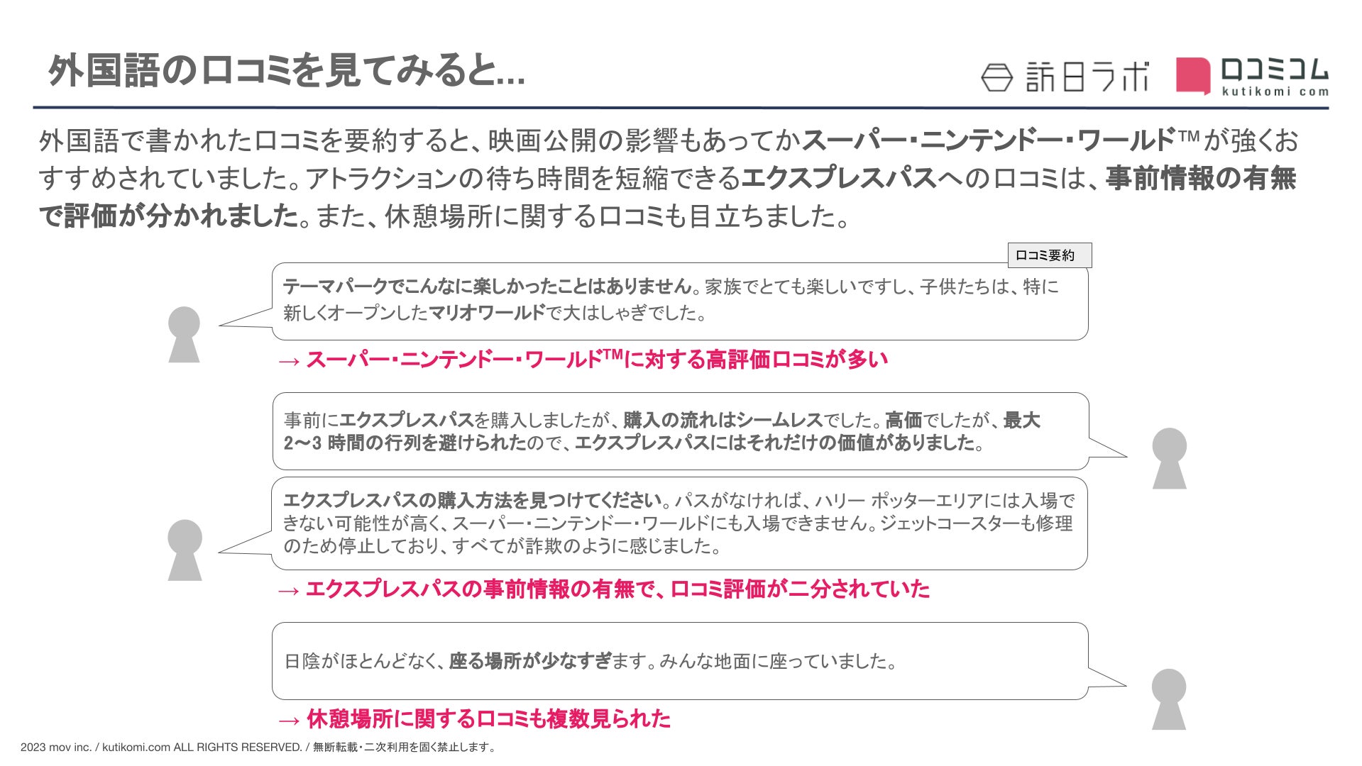 外国語で書かれた口コミを要約すると、映画公開の影響もあってかスーパー・ニンテンドー・ワールド™が強くおすすめされていました。