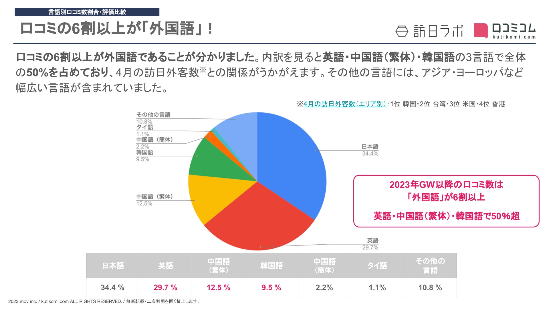 口コミサイトを”もっと”売上に変える店舗支援SaaS「口コミコム」及び国内最大級メディア『訪日ラボ』を運営する株式会社mov(代表取締役:渡邊 誠、本社:東京都渋谷区、以下mov)では、『口コミコム』の分析機能を用いてレポートを作成しています。