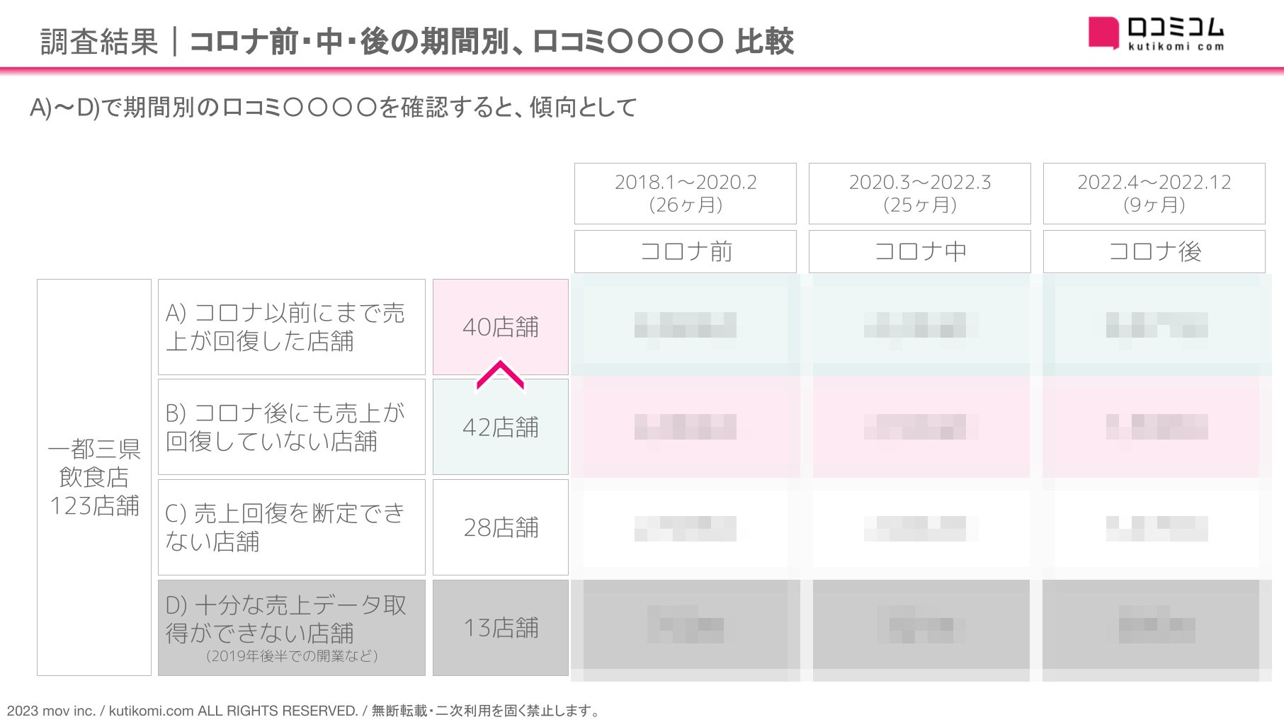 コロナ前、中、後の期間別に「コロナ以前にまで売上が回復した店舗」「コロナ後にも売上が回復していない店舗」を比較しました。