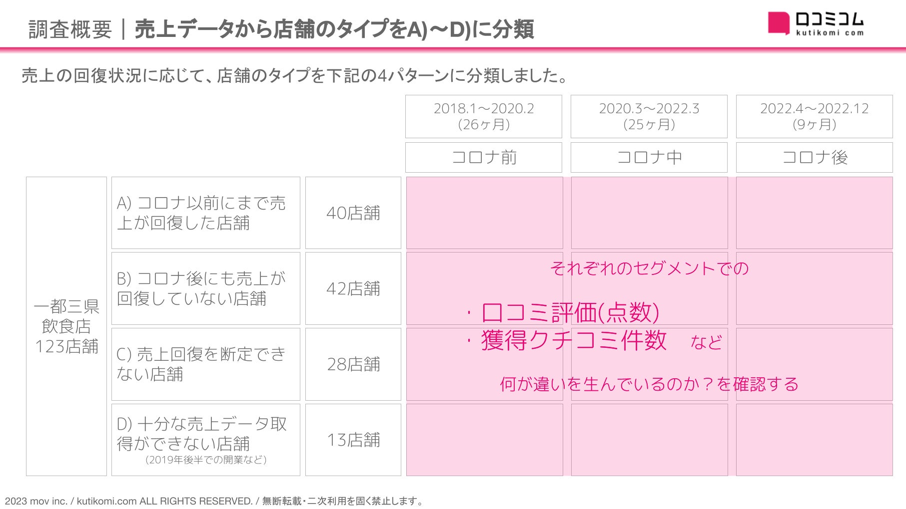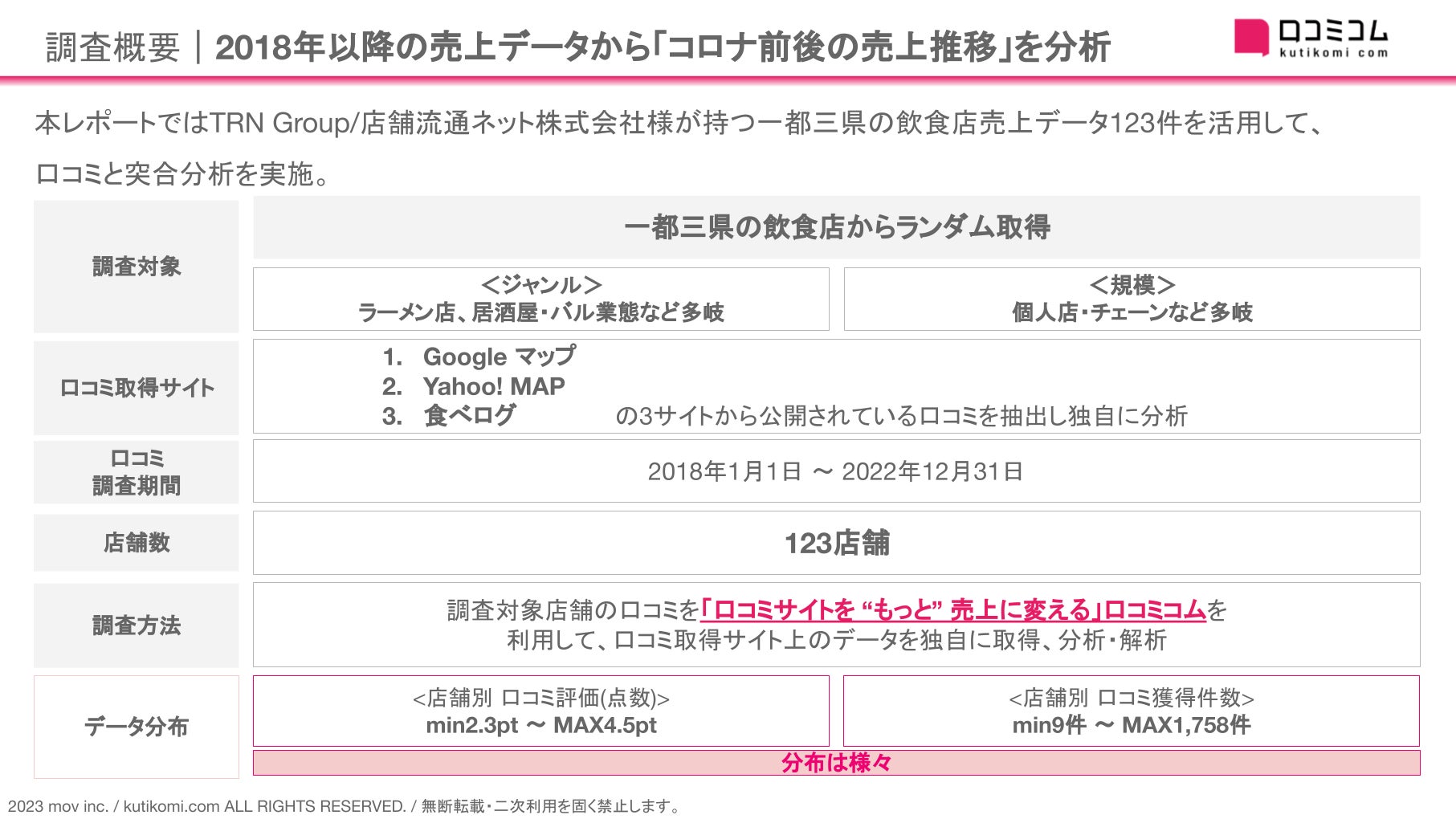 口コミサイトを”もっと”売上に変える店舗支援SaaS「口コミコム」を運営する株式会社mov(代表取締役:渡邊 誠、本社:東京都渋谷区、以下mov)は、TRN Group/店舗流通ネット株式会社様が持つTRN Group/店舗流通ネット株式会社様が持つ一都三県の飲食店売上データ123件を活用した口コミ分析を実施しました。
