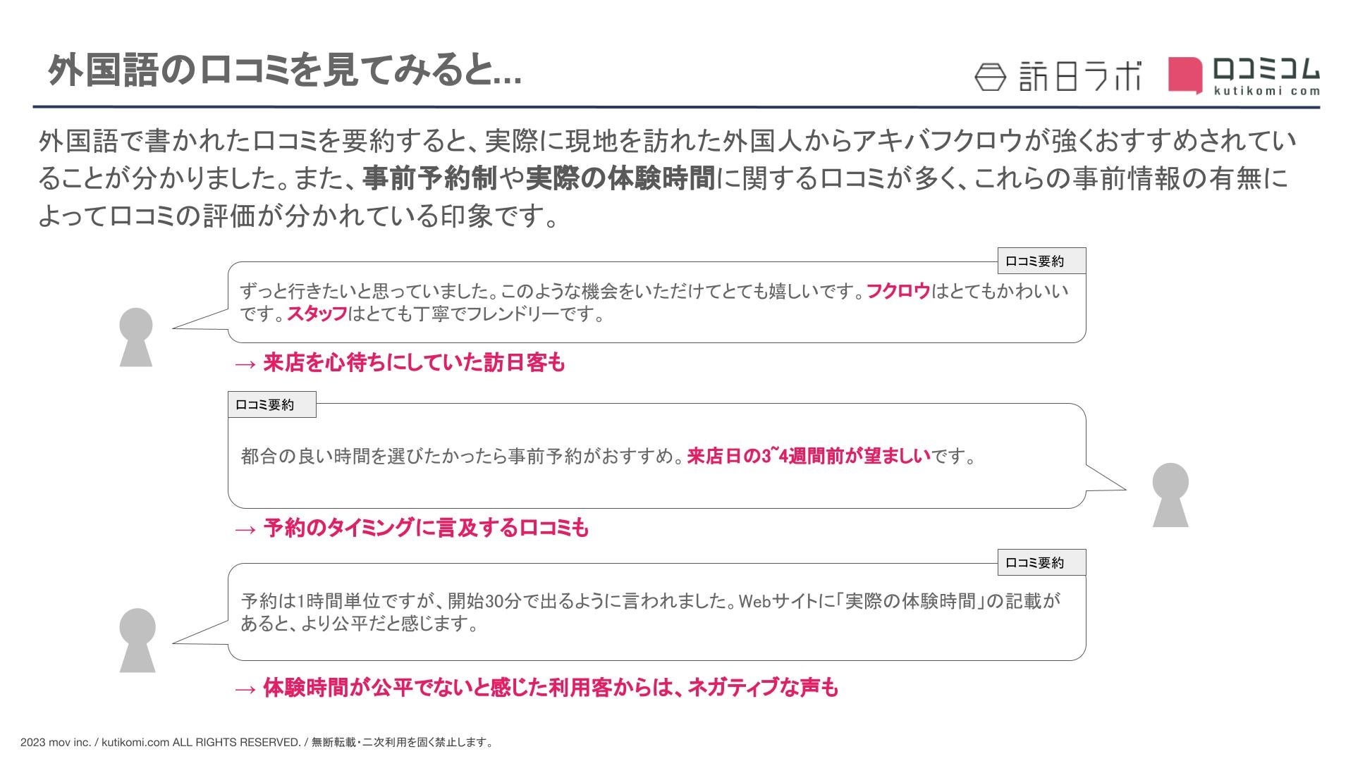インバウンド客足復活『アキバフクロウ』口コミを言語別分析調査:「予約タイミング」「時間」に関する外国人口コミに特徴