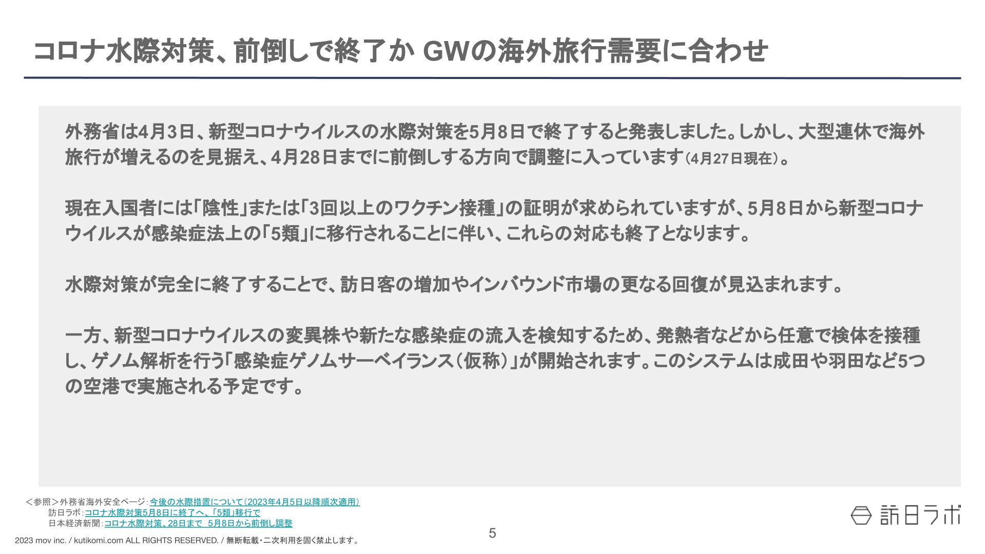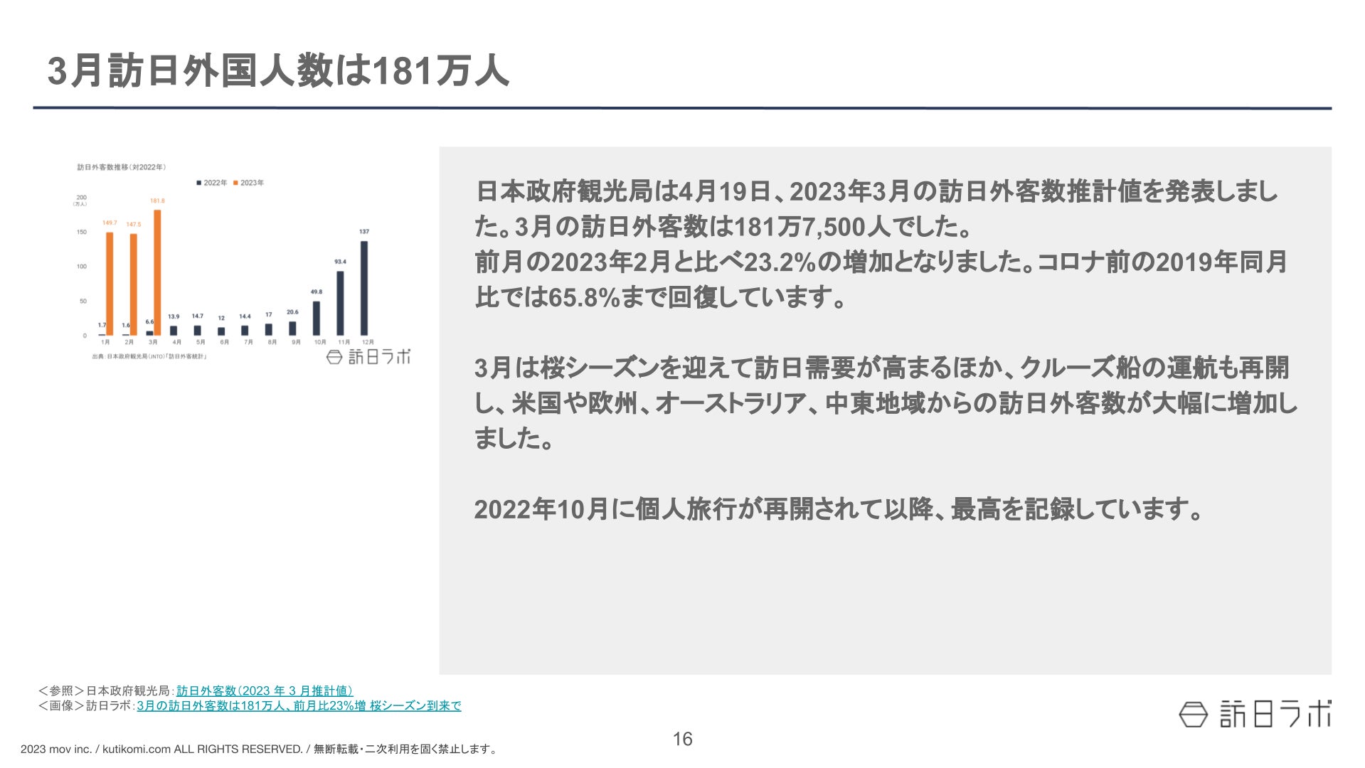 国内最大級のインバウンド総合メディア「訪日ラボ」を運営する株式会社mov(代表取締役:渡邊 誠、本社:東京都渋谷区、以下mov)は、「インバウンドに関連する政府&自治体などの取り組み」「各国の出入国の動向」を始め、インバウンド対策に役立つニュースをまとめた「インバウンド動向まとめ【2023年3月〜4月版】」を公開しました。
