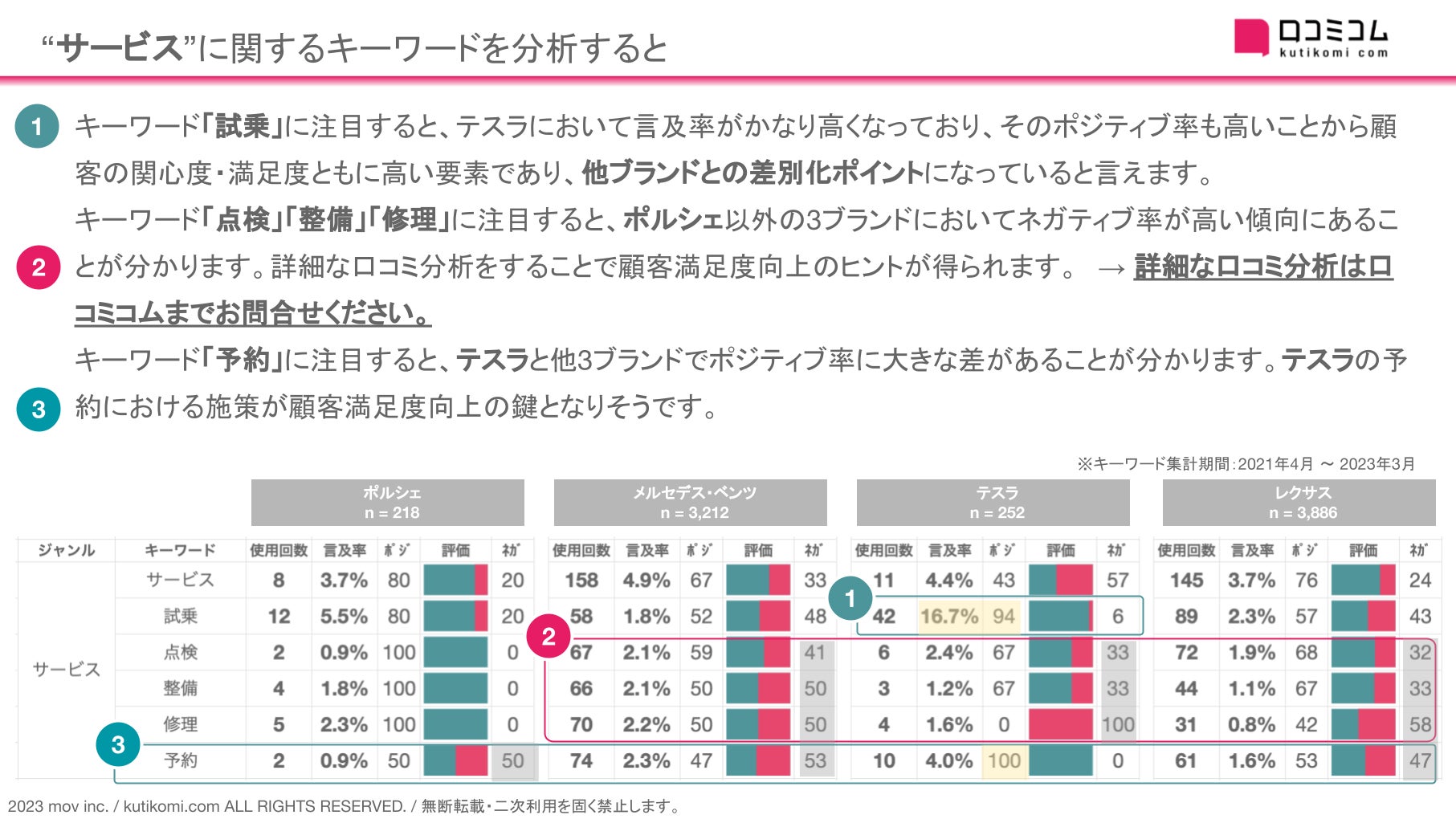 キーワード「試乗」に注目すると、テスラにおいて言及率がかなり高くなっており、そのポジティブ率も高いことから顧客の関心度・満足度ともに高い要素であり、他ブランドとの差別化ポイントになっていると言えます。