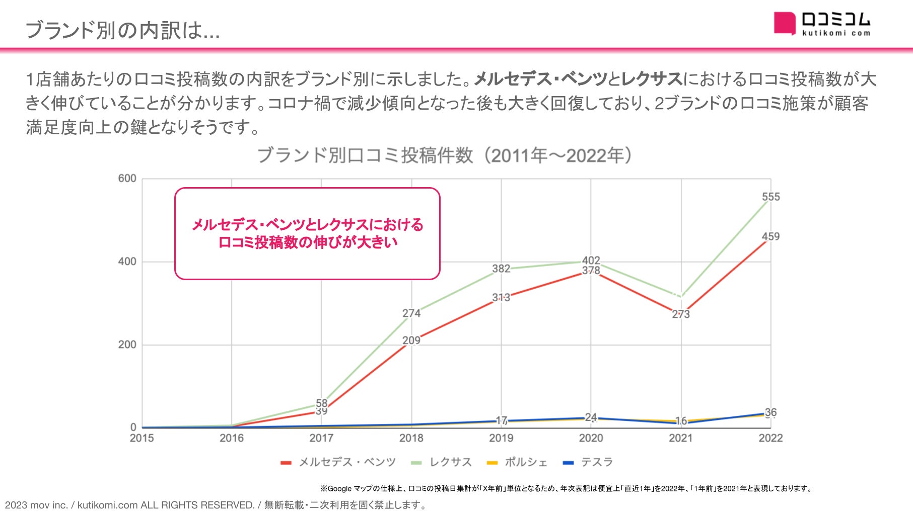 ・レクサス、ベンツの新規口コミ投稿数の伸びが大きく、またコロナ禍からの回復が早かったこと