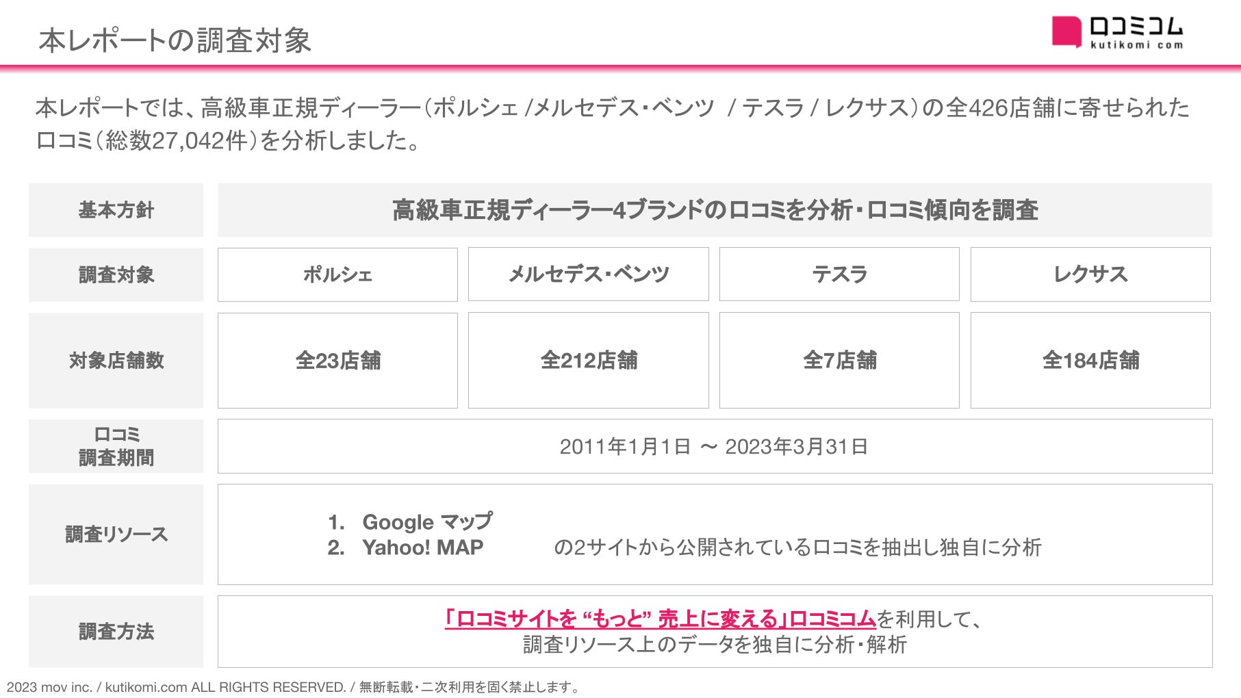 今回は、高級車ディーラー4ブランド(レクサス / ベンツ / テスラ / ポルシェ)に寄せられた約2.7万件の口コミを調査し、4ブランドの比較検証をしました。