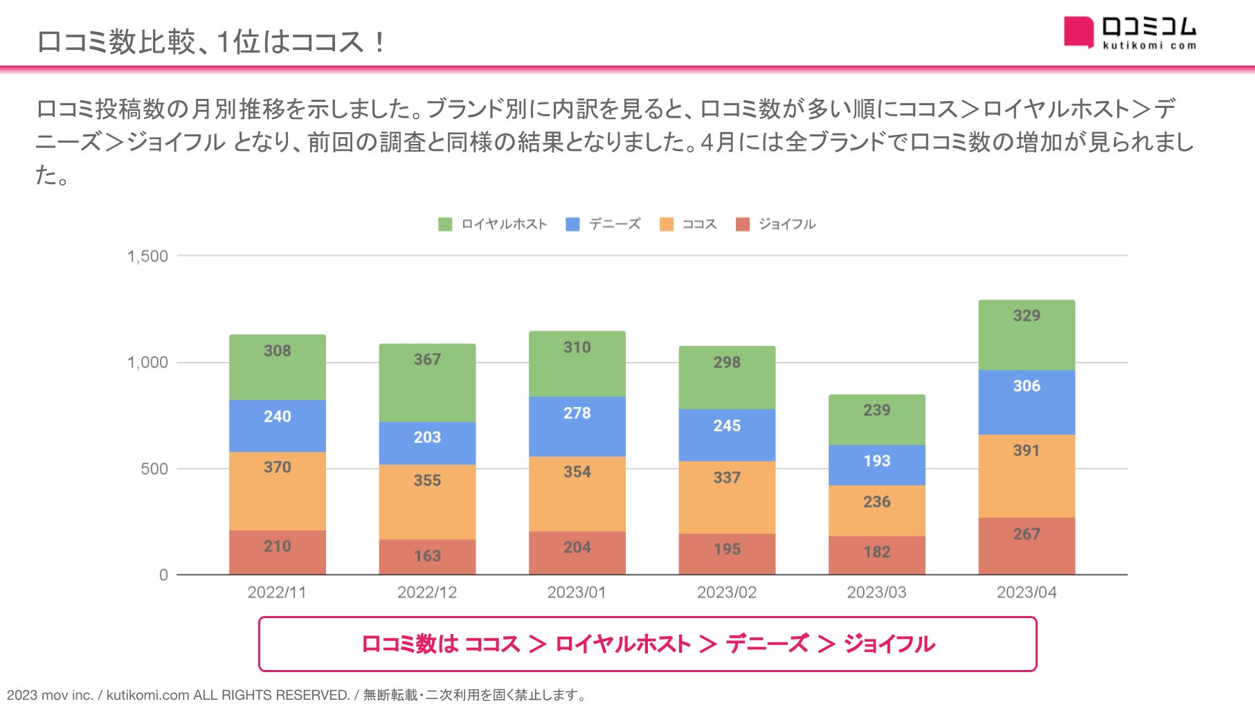 ブランド別に内訳を見ると、口コミ数が多い順にココス>ロイヤルホスト>デニーズ>ジョイフル となり、前回の調査と同様の結果となりました。