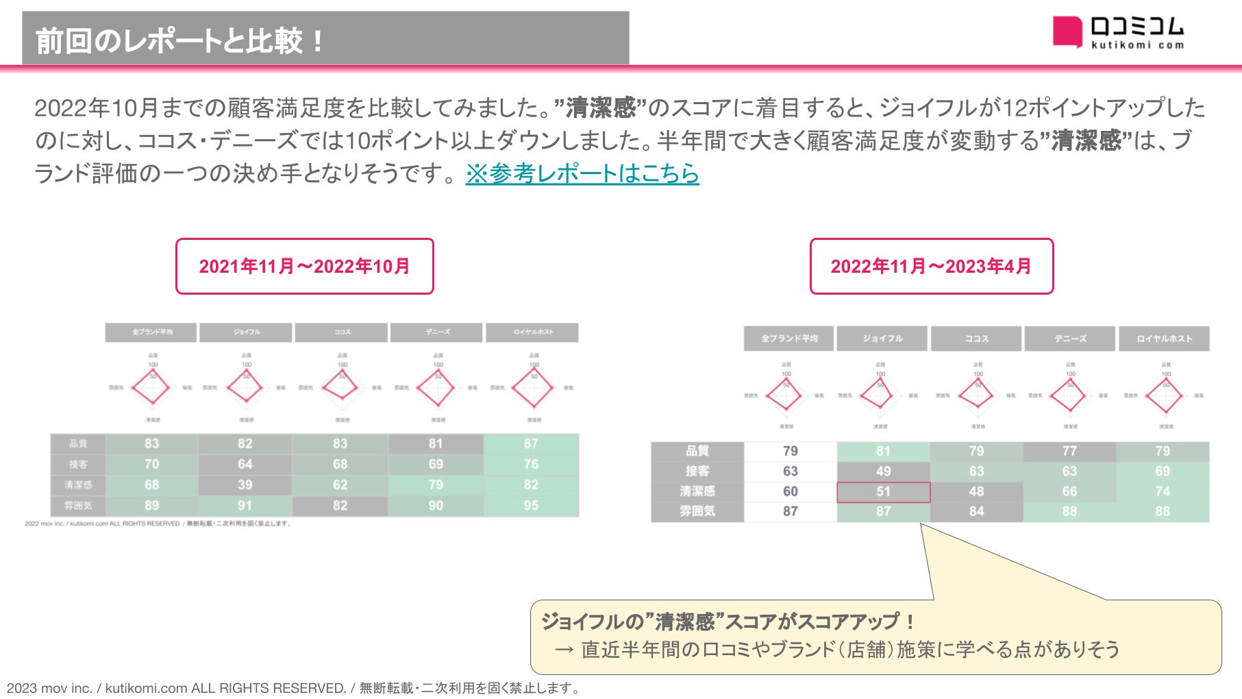 2022年10月までの顧客満足度を比較してみました。”清潔感”のスコアに着目すると、ジョイフルが12ポイントアップしたのに対し、ココス・デニーズでは10ポイント以上ダウンしました。