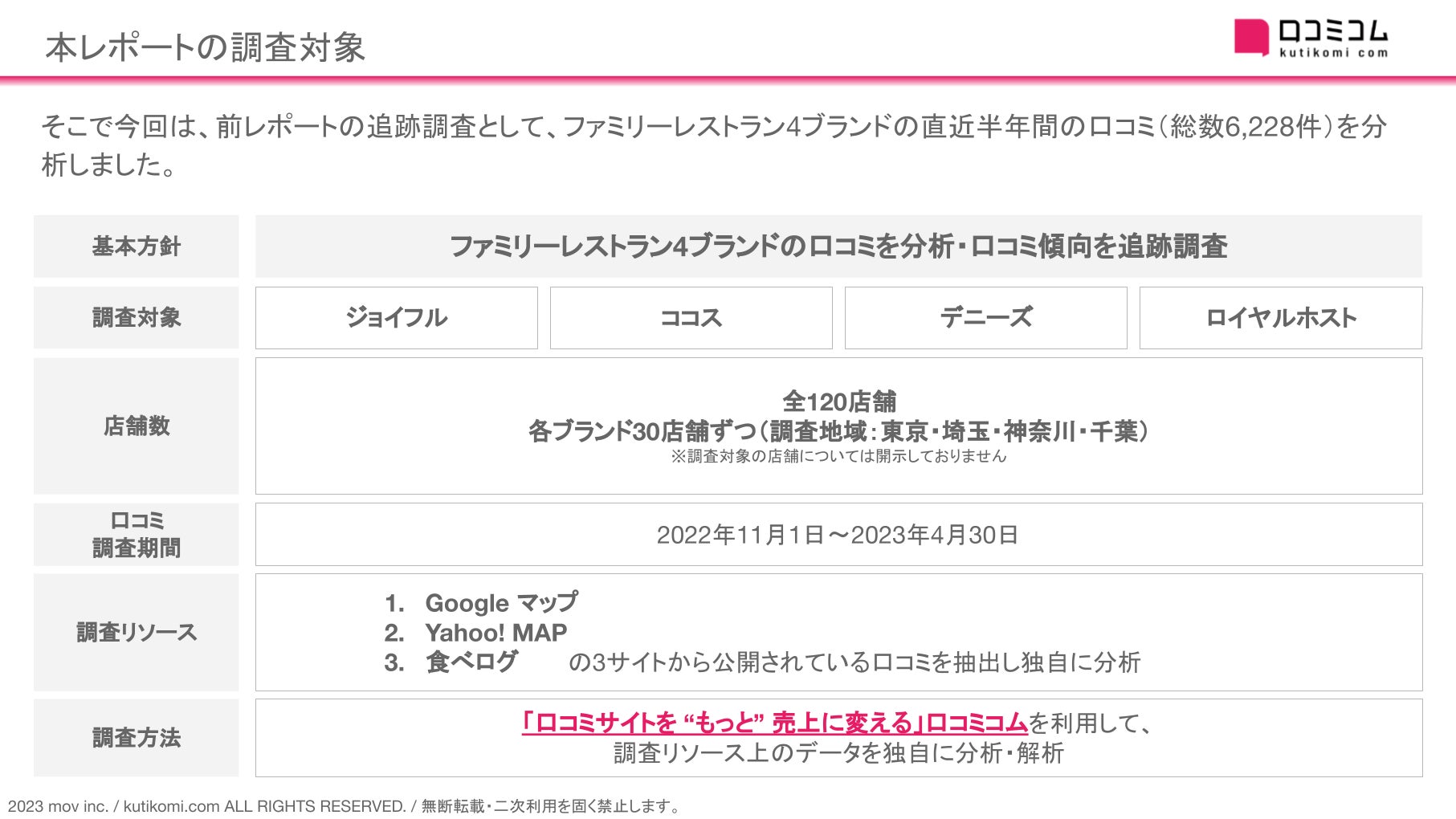 本レポートでは、ファミリーレストラン4ブランドの直近半年間の口コミ(総数6,228件)を分析しました。