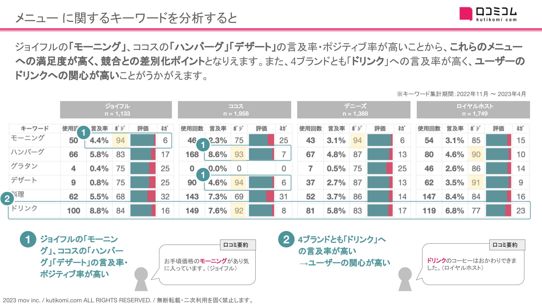 ジョイフルの「モーニング」、ココスの「ハンバーグ」「デザート」の言及率・ポジティブ率が高いことから、これらのメニューへの満足度が高く、競合との差別化ポイントとなりえます。