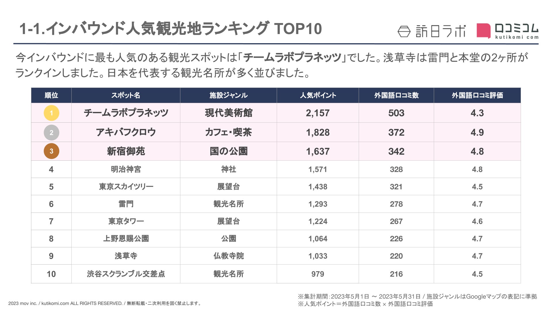 国内最大級メディア『訪日ラボ』及び 口コミサイトを”もっと”売上に変える店舗支援SaaS「口コミコム」を運営する株式会社mov(代表取締役:渡邊 誠、本社:東京都渋谷区、以下mov)は、観光名所に寄せられた最新の口コミデータから、独自の『インバウンド人気観光地ランキング』を発表しました。
